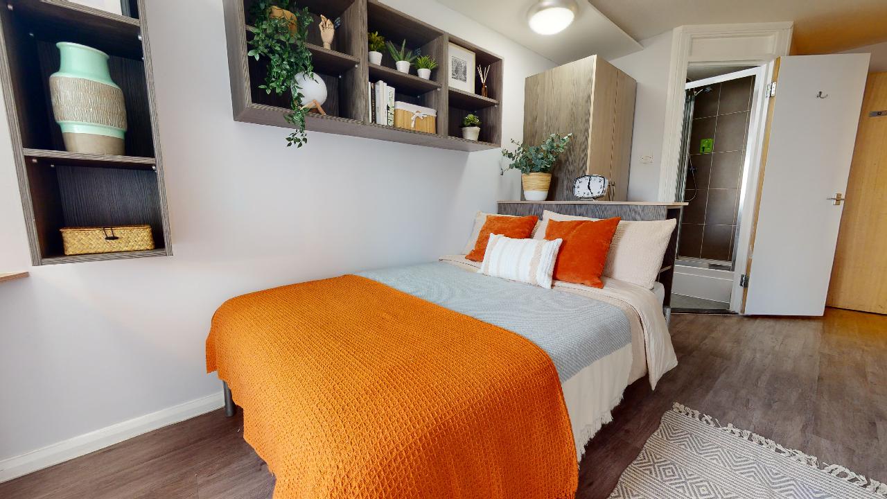 LAMB300-081125Our 11 sq m Gold En Suite rooms benefit from sharing their kitchen and living room with just four other flatmates. These rooms come with small double bed, lots of storage and study area and share a stylish and kitchen living space with up to 4 other rooms. This excellent social atmosphere combines with building perks like a bowling alley, cinema, gym, laundry and karaoke and games room.