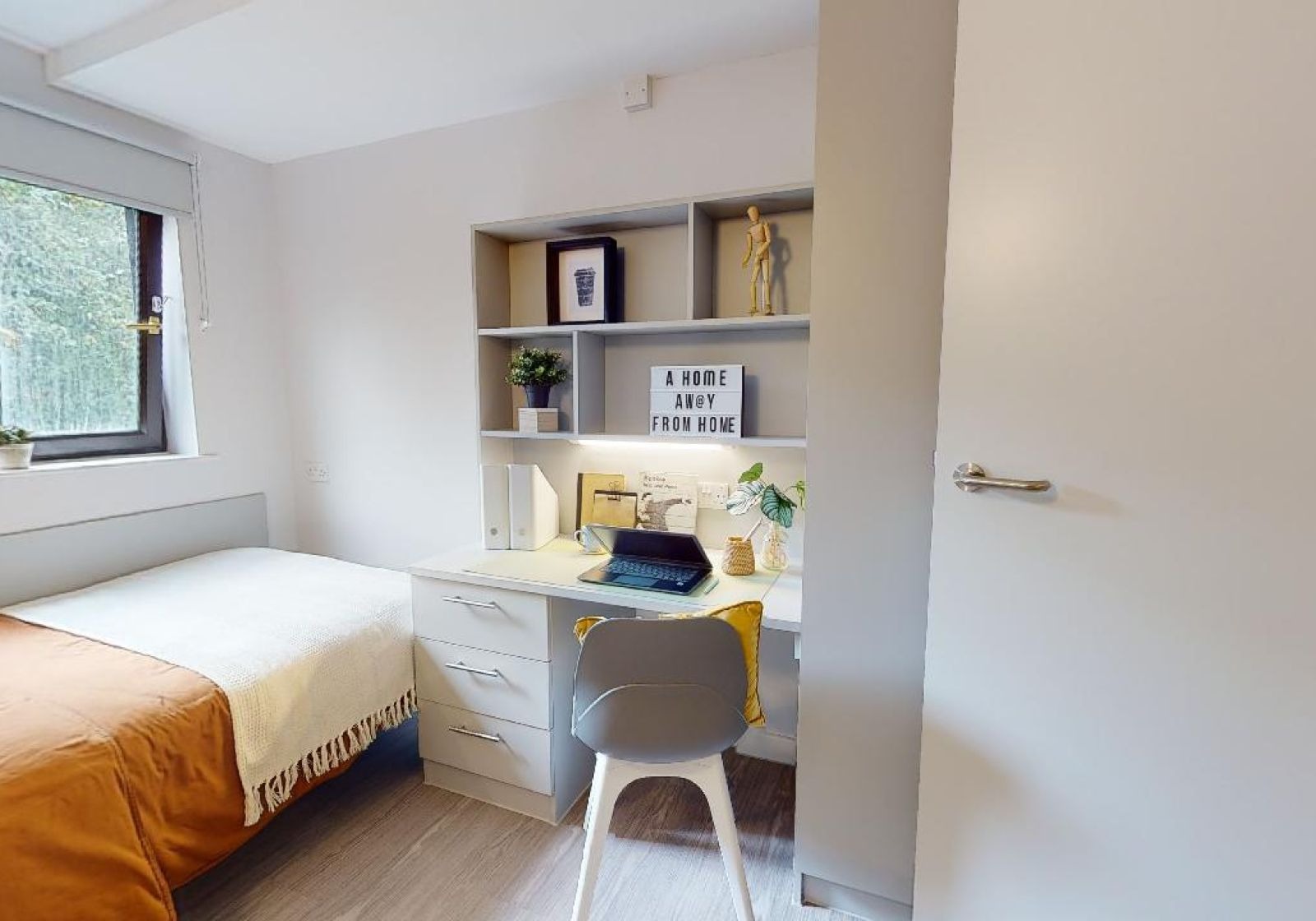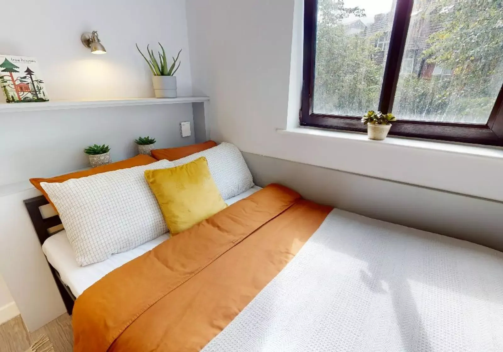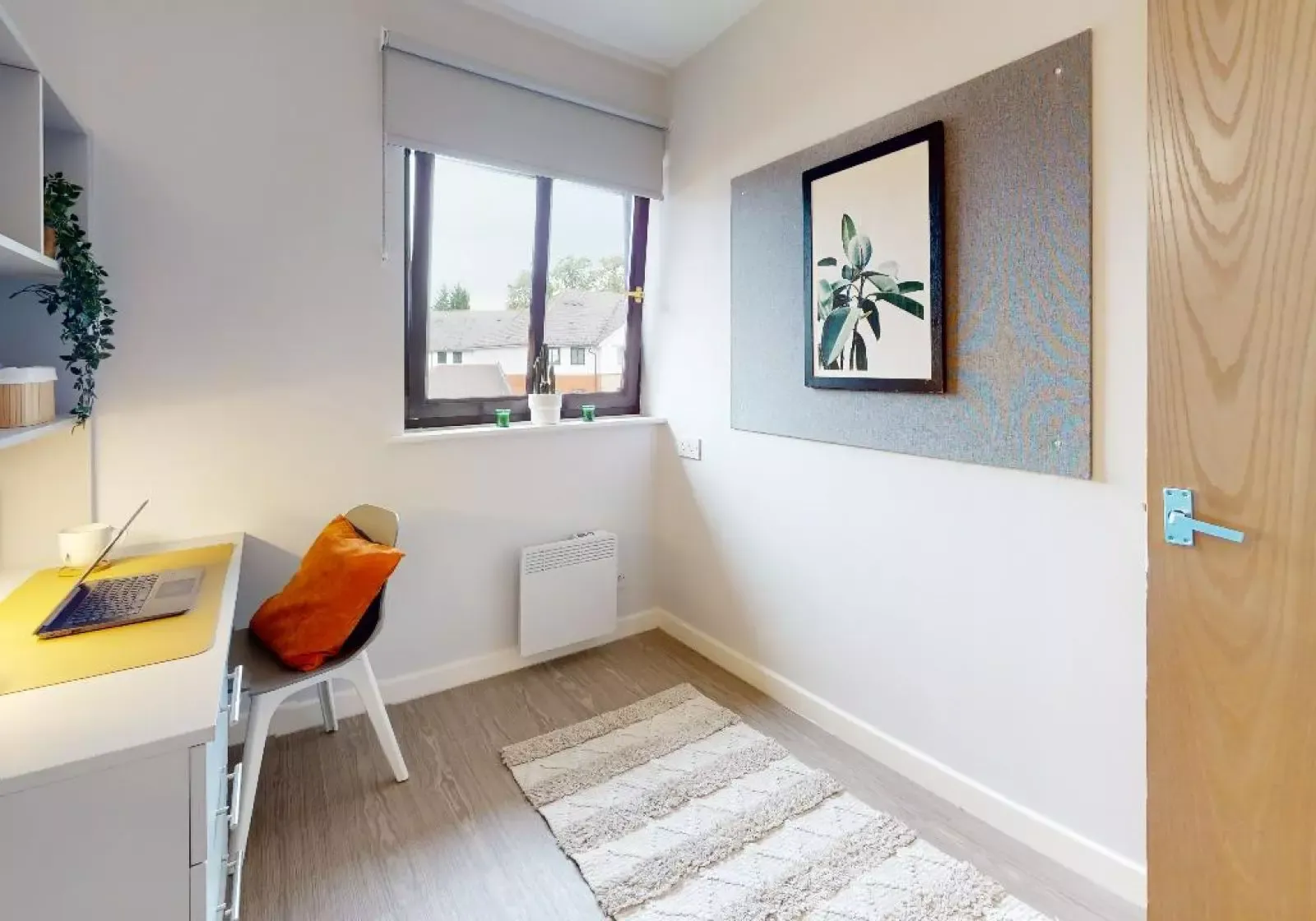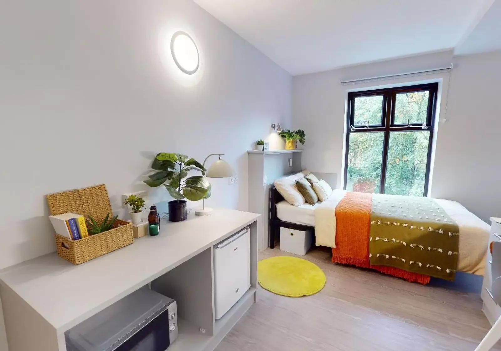 This studio on the ground or first floor is well-equipped with the essentials of student life, all just a short walk from many of Manchester's university campuses. This room is single occupancy. In these studios, you'll find all the furnishings you need. There's a small double bed, study area, storage, and private shower room, microwave, kettle, and mini-fridge. They also have use of a more extensively equipped shared kitchen and living area, as well as all the amenities and social spaces found on site.