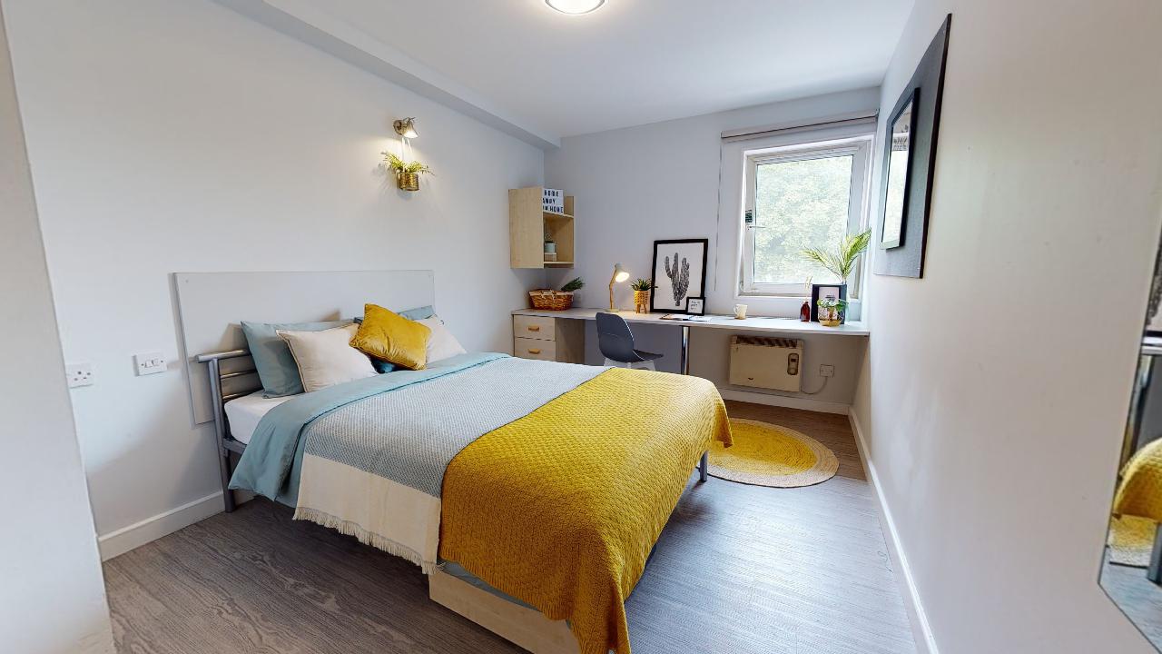 Located on floors ground to 6 and with 12 sq m of living space, these are our entry-level rooms. Each comes with a small double, study area and your own en suite bathroom, these rooms are great value.
