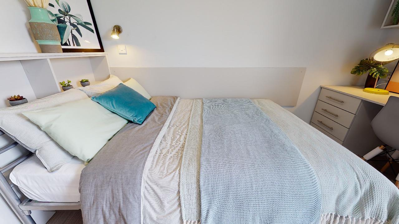 Our Bronze Plus rooms provide 16 sq m of living space, located on floors ground to 6. You'll find a double bed, study desk and chair accompanied with your own en suite bathroom. Share a kitchen and living space with flatmates providing community alongside privacy. Each communal kitchen includes a TV, breakfast bar and stools.