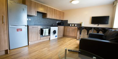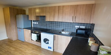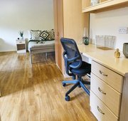 A Spacious self-contained studio with a ¾ double bed, study desk and wardrobe. The studio has a modern kitchen with integrated facilities, En-suite bathroom, lounge area with a plasma TV and up to 100Mbps WIFI.