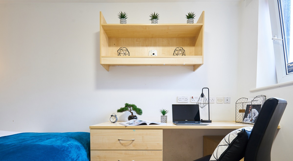 Spacious bedroom with a ¾ double bed, En-suite bathroom, study area and wardrobe. The shared area includes a lounge and kitchen area with TV and up to 100Mbps WIFI throughout.