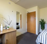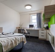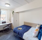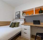 The Silver Plus Non Ensuite is a medium sized bedroom, containing a small double bed, wardrobe, shelving, study desk and chair. It’s one of our more recently refurbished room types, and is set within a 4 bed flat meaning you’d share the toilet/shower-room, kitchen and lounge area with your flatmates.