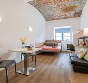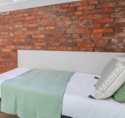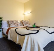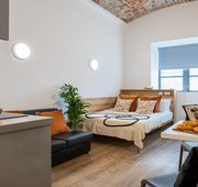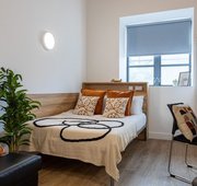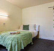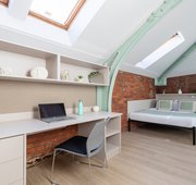 The Copper Studio is a medium open-plan studio, containing a double bed, study desk and chair, wardrobe, shelving, en-suite and kitchen/lounge area. It is situated on the basement/lowest floor of the building.