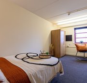 The Bronze Plus None Ensuite is a standard sized bedroom, containing a small double bed, double wardrobe, shelving, study desk and chair. It’s set within a 4 bed flat, meaning you’d share the toilet/shower-room, kitchen and lounge area with your flatmates.