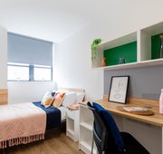 The Platinum Studio is a large open-plan studio which includes a double bed, study desk and chair, wardrobe, shelving, en-suite and kitchen/lounge area. It’s a great option for students who want to have their own private space in a large studio, but still want to live in a vibrant student community!