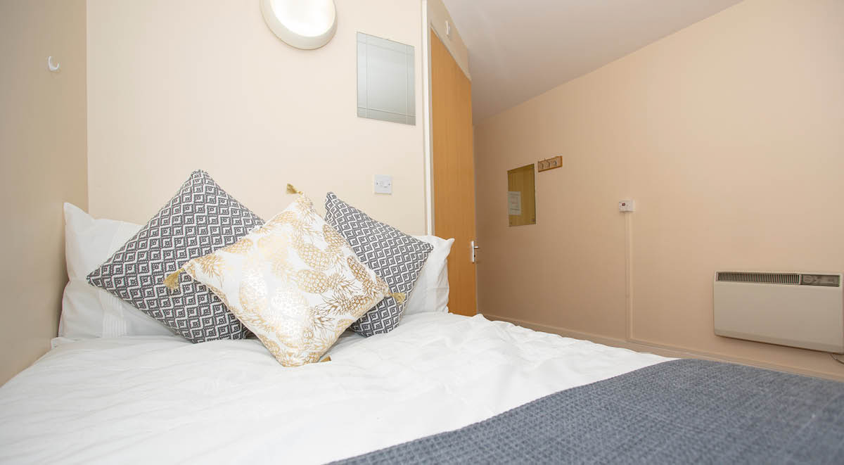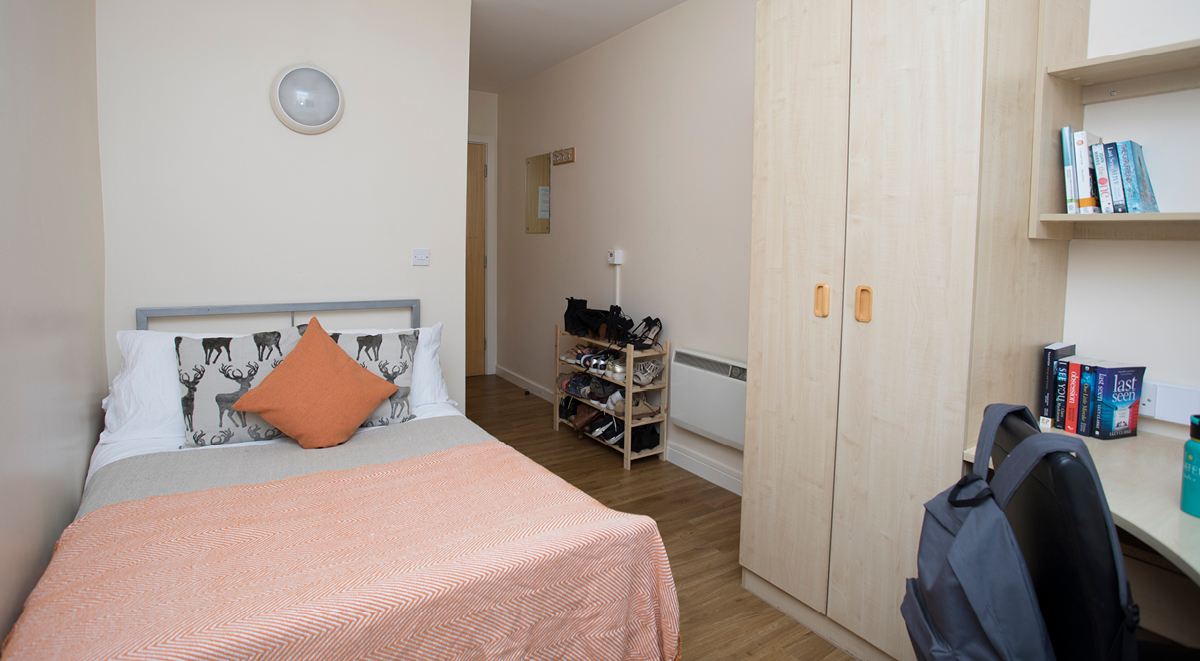 The room comes with a small double sized bed, a desk and chair, a wardrobe, drawers, and a bedside table. You’ll also have your own en-suite bathroom for more privacy. Within this cluster flat you’ll share a kitchen which has modern appliances and a breakfast bar and stools. Our shared areas also have comfy sofas so you can chill out with your flatmates. Whilst staying with us you can make the most of the Park View common room, which has a TV and Sky.