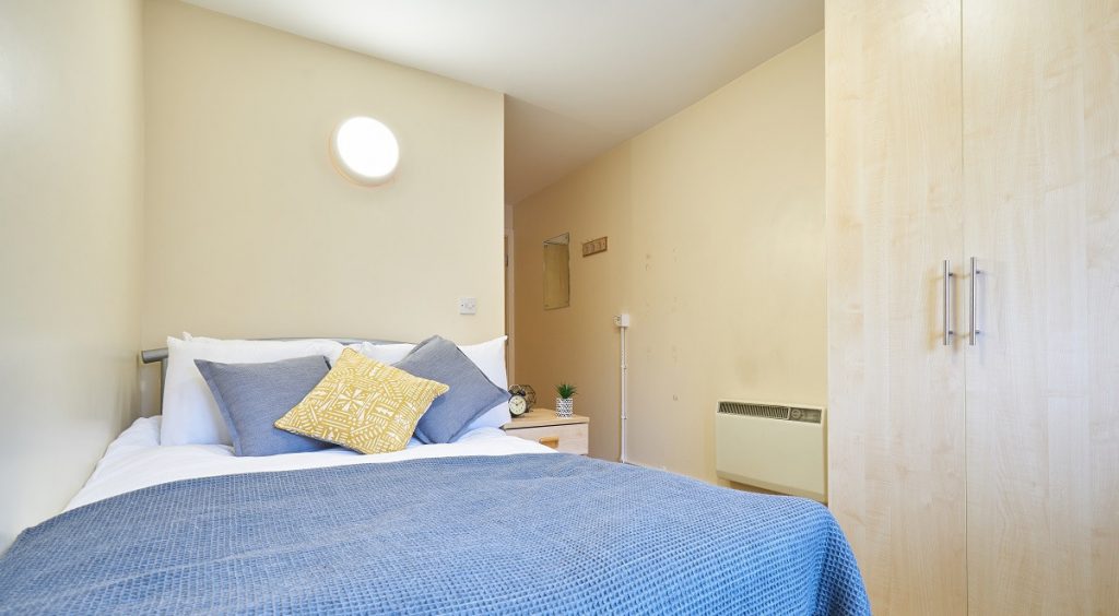 Modern spacious Bedroom measuring 19m² with a ¾ double bed, En-suite bathroom, study area and wardrobe. The shared area includes a lounge and kitchen area with a TV and up to 100Mbps WIFI throughout. There is also an undercover outside seating area, bike racks and secure access throughout the building.
