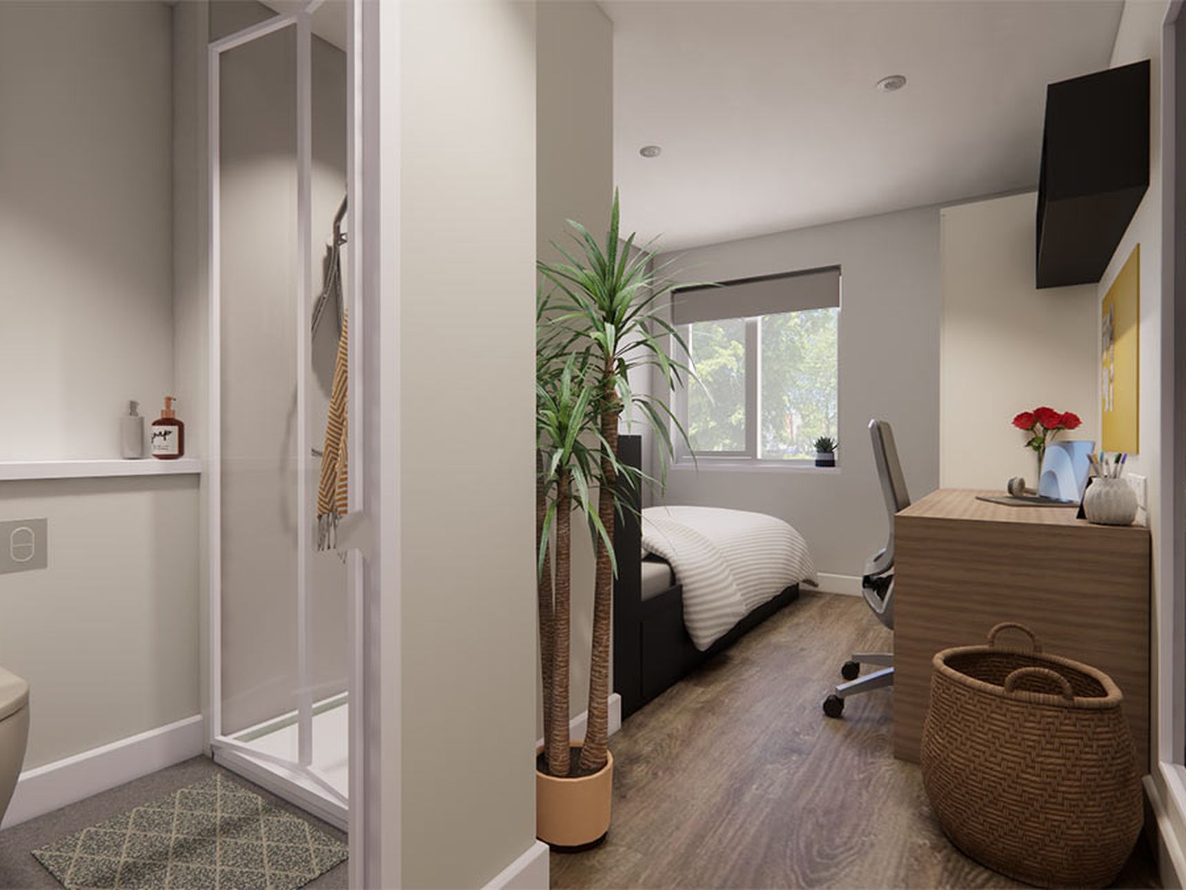 An ensuite room is a private accommodation with access to an attached bathroom. Most ensuite student accommodation in Manchester include a double bed, storage space and a private study area. The ensuite is a great option for students looking for private and affordable accommodation.
