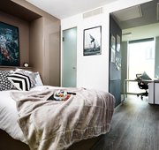 The classic Vita Student studio with double bed, ensuite bathroom, desk area and kitchen. Room Size : 18sqm. Prices may vary as per the floor level.