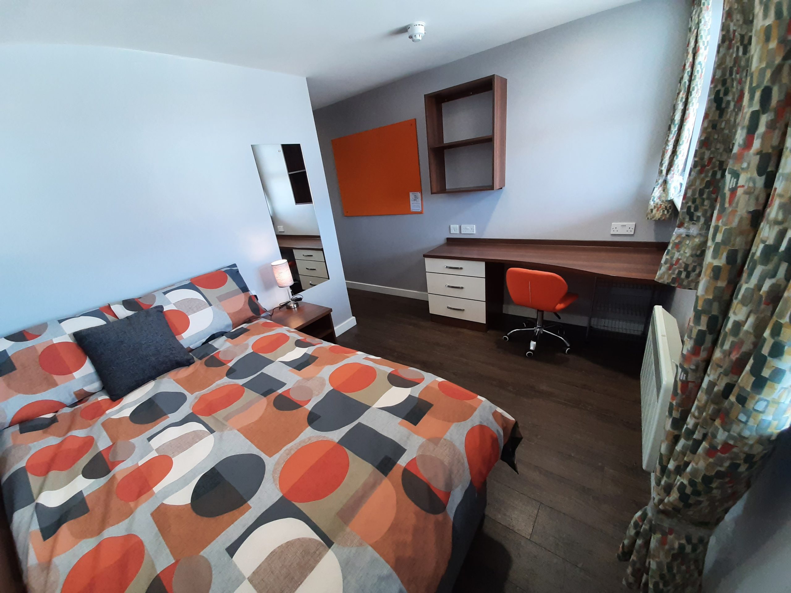What's in the room? ¾ size double bed with under bed storage En-suite bathroom with shower and WC Full-length mirror Pinboard Study desk with drawer space and chair Wardrobe What’s in the shared kitchen? 4-ring hob with extractor Electric oven Full-size fridge freezer Shared dining table and chairs