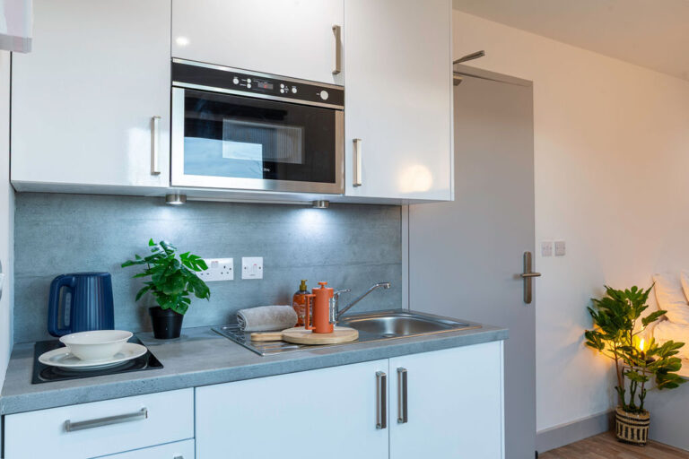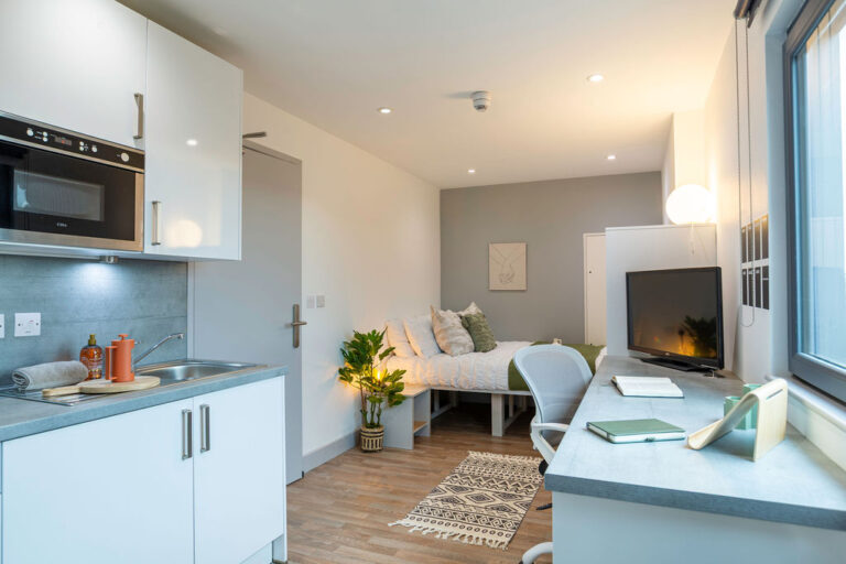 Our Classic Studios, located on various floors, provide provide 16m² of self-contained living space. Each studio includes a double bed with under-bed storage, a wardrobe, a study area, a fully fitted kitchenette, and a private en-suite bathroom. With all-inclusive bills and Wi-Fi, you can enjoy a comfortable and connected student life.