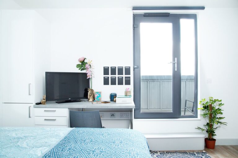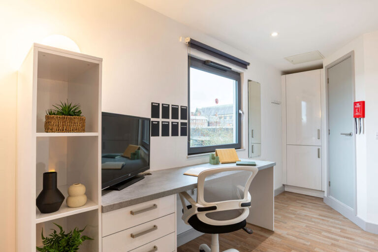 Our Classic En-suites, located across various floors, provide 11–14m² of well-designed space. Each room features a double bed, a private en-suite bathroom, a wardrobe, and a dedicated study area. The shared kitchen and communal lounge, equipped with a smart TV, offer excellent opportunities for socialising. With all-inclusive bills and Wi-Fi, you can enjoy a comfortable and connected student life.