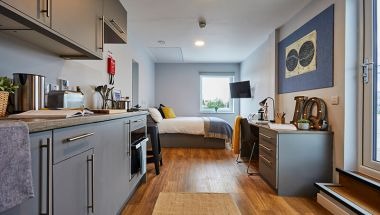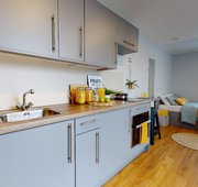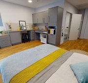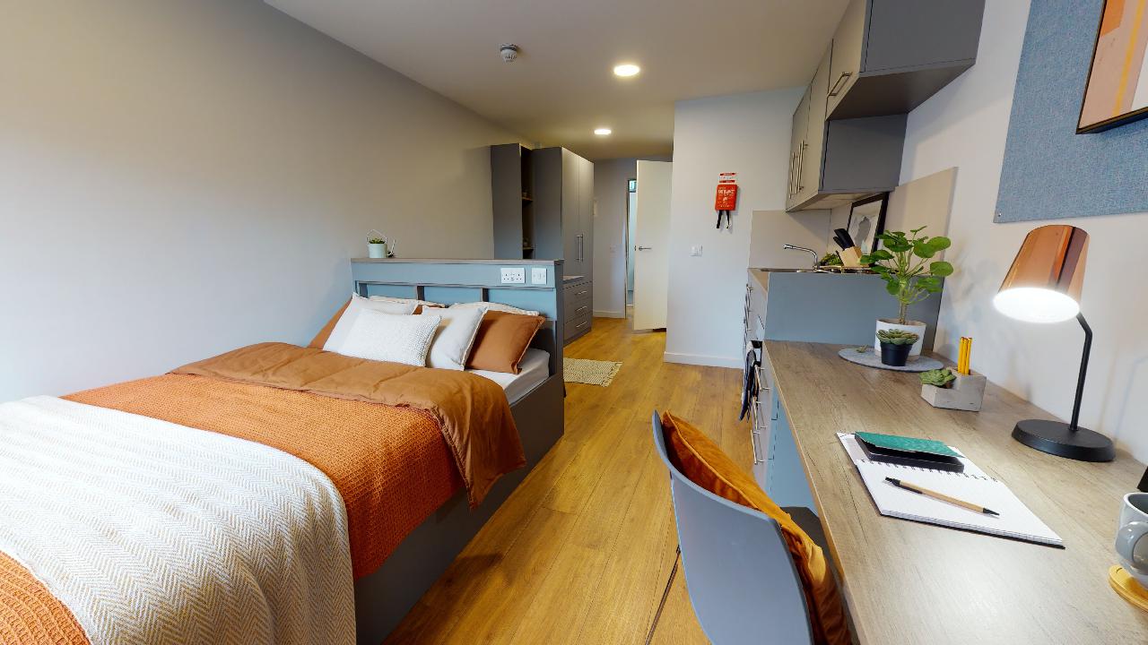 COLL250-03112531 sq m of space with all the same great features as our Silver Studios but with a even more space, these self-contained rooms are perfect for anyone wanting added privacy and breathing room. These massive ground floor studios come with full-size double bed, private bathroom, 32” Smart TV, lots of storage, fully kitted kitchen, stylish furniture and study area. With a cinema, gym, games room and additional shared roof terrace, this building has superb perks too.
