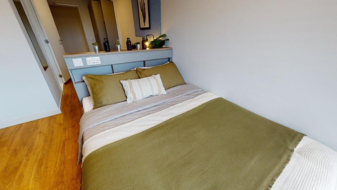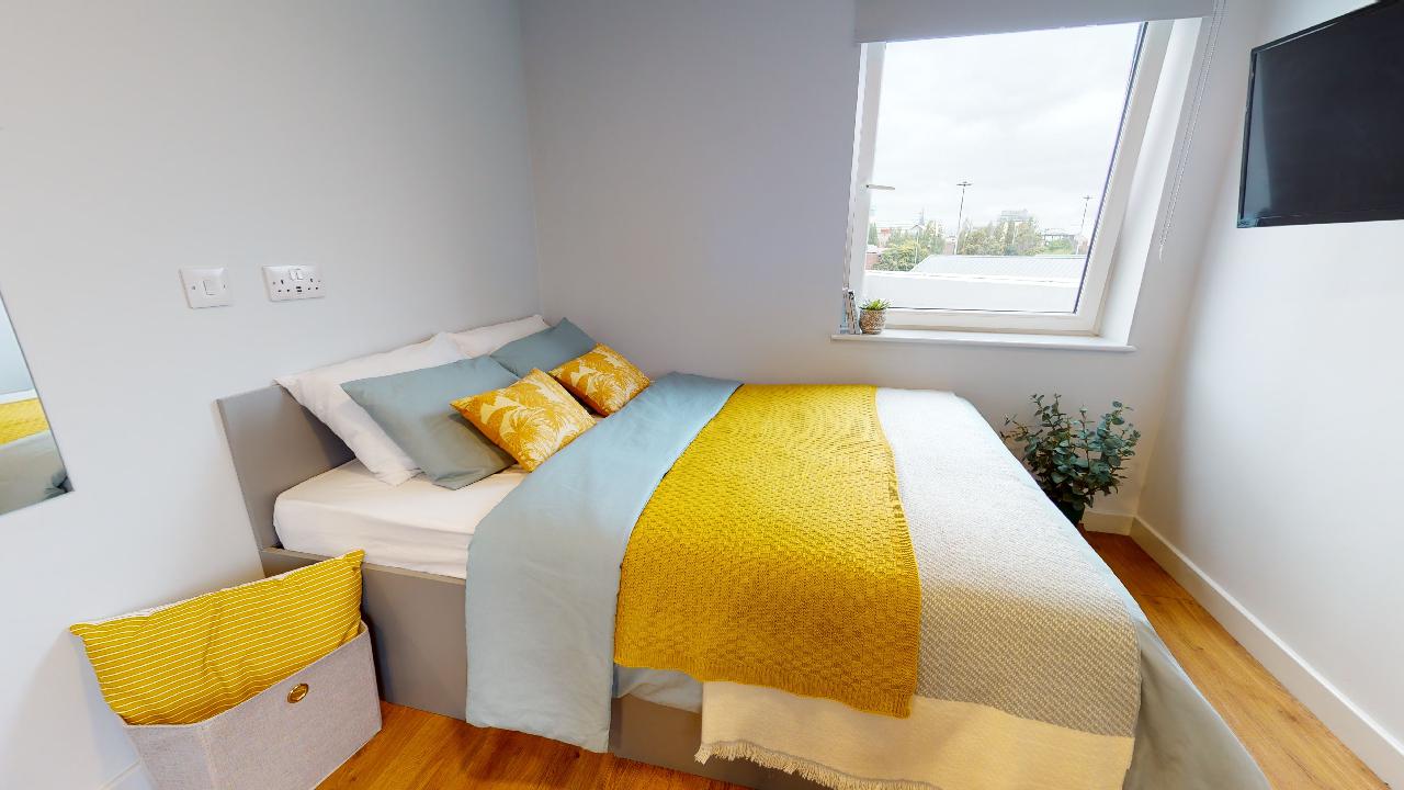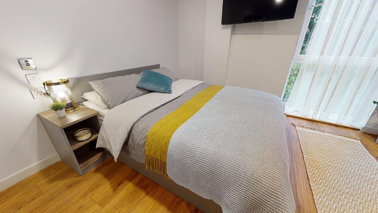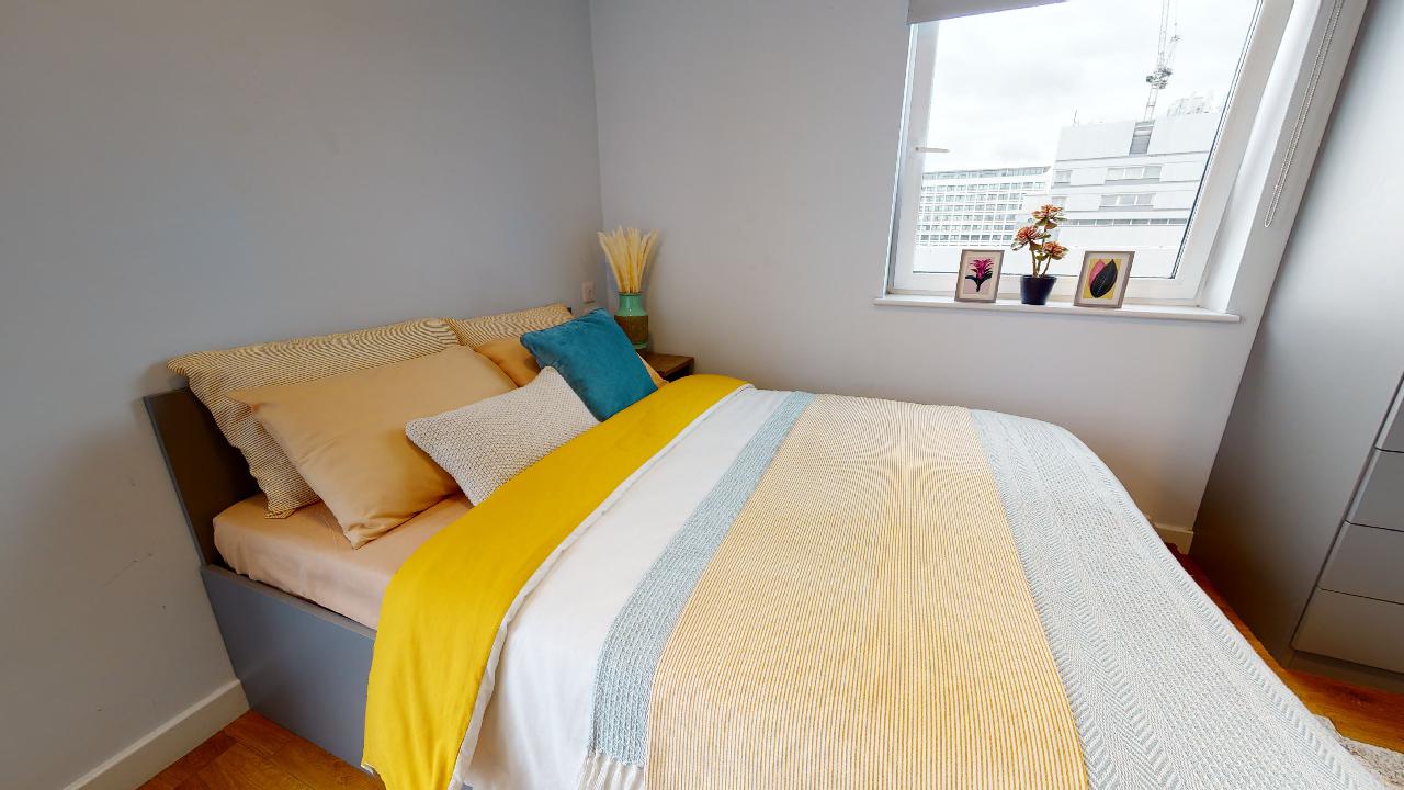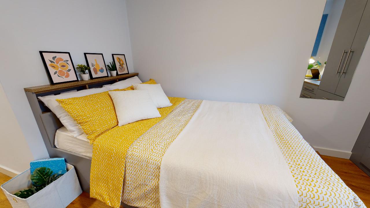 COLL250-031125All the features of our Bronze En Suite rooms but with an upgraded full-size double bed, better views and more peace and quiet from their higher position in the building. As well as your 13 sq m room on floors 4-6 with private bathroom, lots of storage and study area, you also share a superb open-plan living room and kitchen with a 40” Smart TV, comfy sofas and all the essential cooking equipment. This new building is also brilliantly kitted-out with cinema, gym, games room and roof terrace with stunning views.