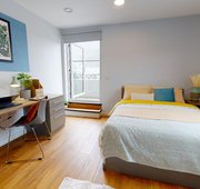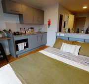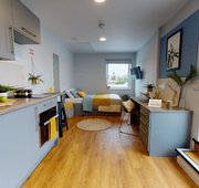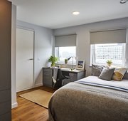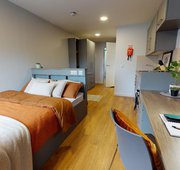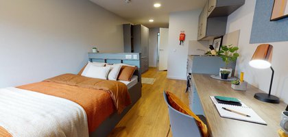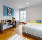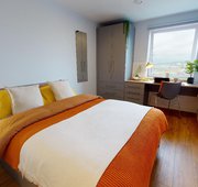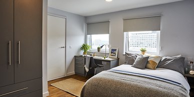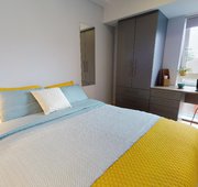 COLL400-110925All the features of our Bronze En Suite rooms but with an upgraded full-size double bed, better views and more peace and quiet from their higher position in the building. As well as your 13 sq m room on floors 4-6 with private bathroom, lots of storage and study area, you also share a superb open-plan living room and kitchen with a 40” Smart TV, comfy sofas and all the essential cooking equipment. This new building is also brilliantly kitted-out with cinema, gym, games room and roof terrace with stunning views.