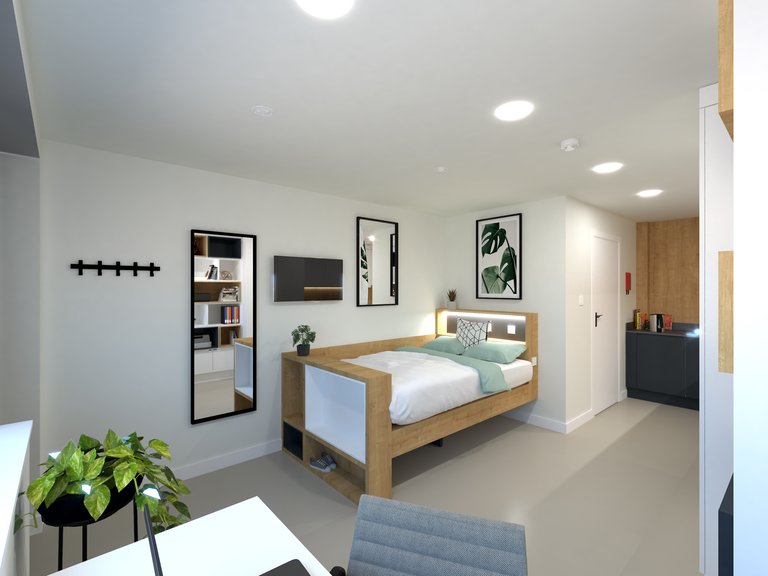 Share a homely kitchen-diner with other students while enjoying the privacy of your own modern room with a swanky bathroom to match! Sizes of this room type vary from 10 Sqm to 14.4 Sqm and you can choose to live in a 5, 6 or 7 bedroom flat. Whichever you choose, your room will have plenty of storage space and a small double bed.