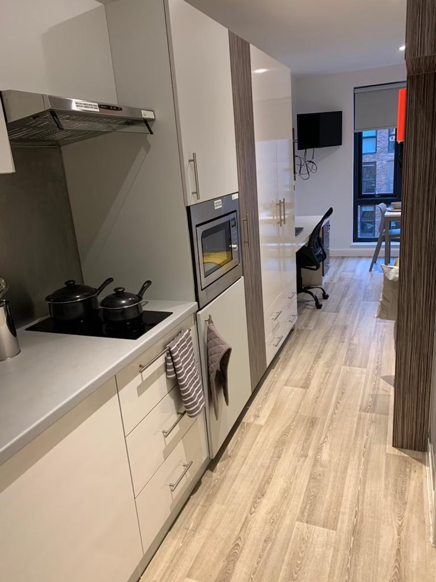 Communal kitchen and living space with 6 en-suite rooms per flat. Small double Wardrobe, underbed storage, full-length mirror, personal study space with desk and chair