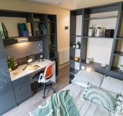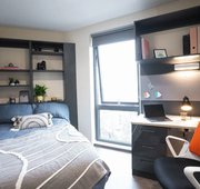 Room size is approximately 14m2 - Private en-suite with shower - Small double bed - Built in bookshelves - Wardrobe - Study desk with chair, shelving and draws - Notice board - Coat hooks - Mirror ---- Premium En-suite rooms are in shared flats of 5 beds - Shared kitchen with dining and lounge area - Under counter built in full or combi oven - Breakfast bar and stools - Fridge/freezer - Cooker - Microwave - Vacuum, broom, mop and bucket - Iron and ironing board - Kettle - Toaster
