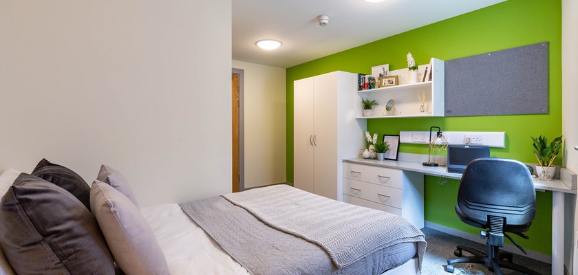 • 4ft or 4ft 6 double bed • 17+ sq. metres • Wireless & wired internet • Under bed storage • En-suite bathroom • Shared kitchen/lounge • Desk, drawers & large fitted wardrobe