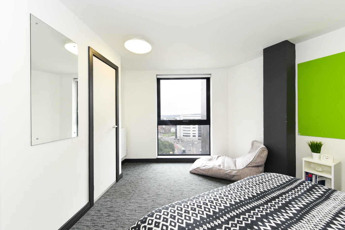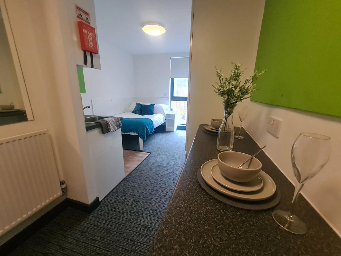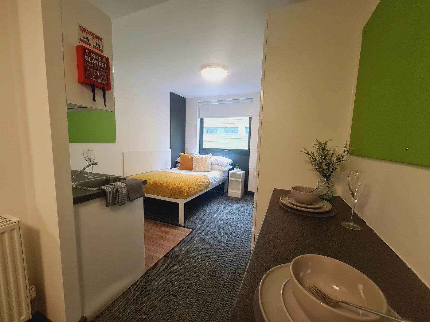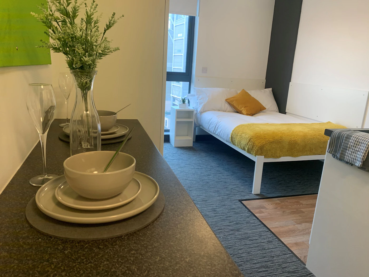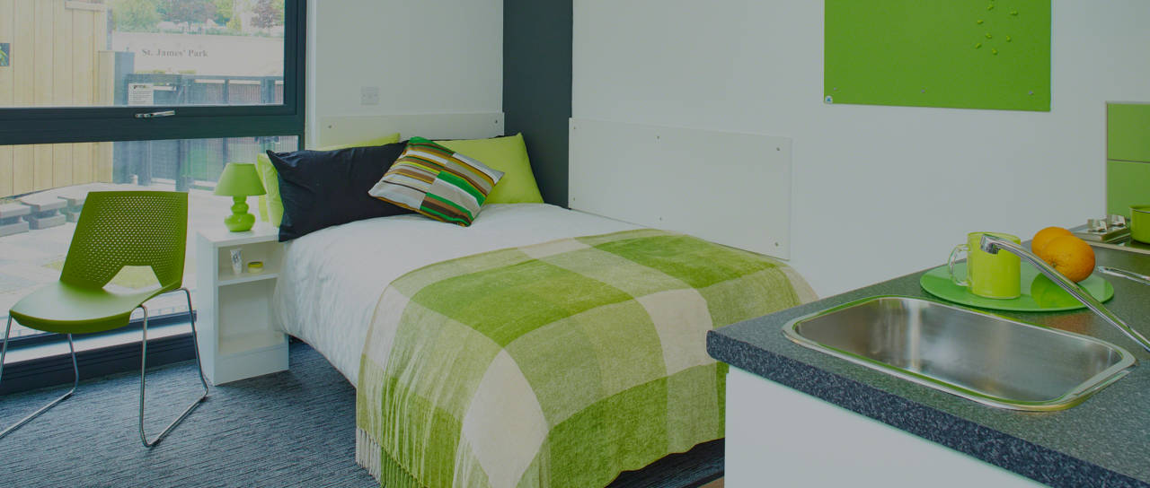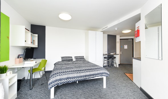 Saint James' Point student halls include several different types of ensuite and studio apartments. Namely, these include ensuite Bronze, ensuite Silver, studio Bronze, studio Silver, studio Silver plus, studio Gold and studio Platinum. All of these different types of rooms offer varied sets of the facilities. You can choose the room that best fits your budget and personal requirements. It respective of which room you choose you will get access to spacious beds, ample storage, designated study areas with desk and chair and a private bathroom. Apart from these you will have access to fully equipped kitchenettes and cosy living spaces where you can spend time with your friends.