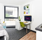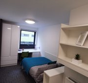 Ensuite bathroom and shared kitchen & living space with up to 5 other students Up to 20m2 3/4 bed (small double) Ensuite bathroom with shower toilet and basin. Under-bed storage, desk, chair, wardrobe and chest of drawers included in the room