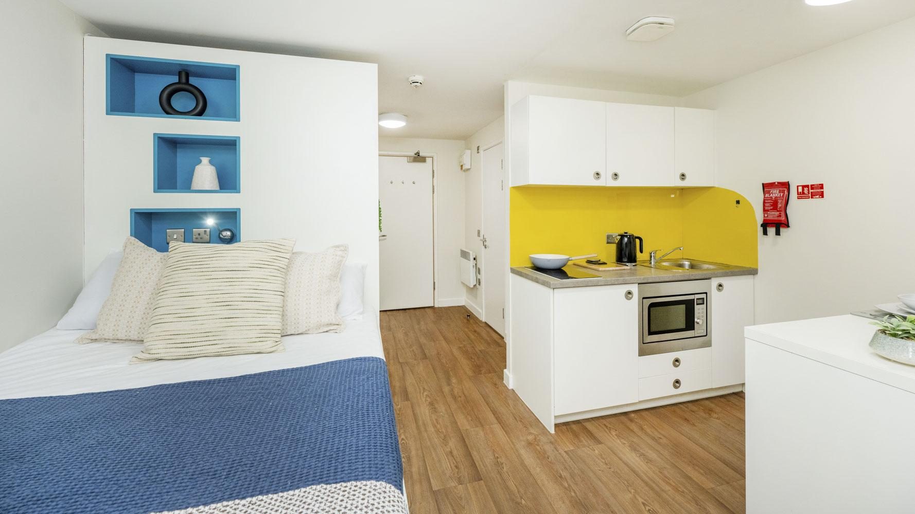 Our modern Studio bedrooms come with a comfy double bed with adequate underneath storage, study area with a desk and chair, and wardrobe. You can make the most of the self-contained kitchen and en-suite bathroom with all the facilities you’ll need for student living. You’ll also have your own bar table and bar stool so you can eat in style!