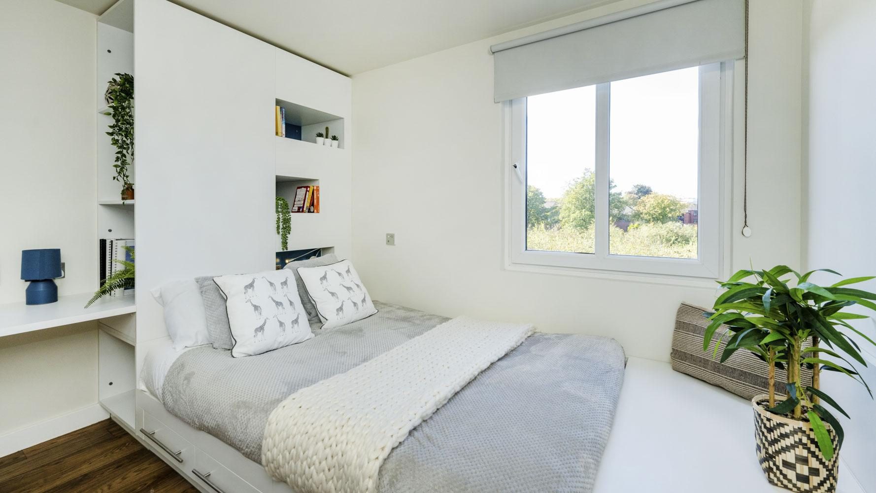 The largest of our room styles measuring 28sqm, this room comes equipped with a double bed, kitchenette, large wet room, desk space and dining table with chairs. Within your very own kitchen space you’ll find a sink, microwave, oven, fridge, freezer and a hob so you’ll be able to cook as much as you like. This luxurious room also features a double study desk so you can invite a friend over to work with you with your two desk chairs! If you’re keen to meet new people, then head downstairs to our sociable spaces like the picture house or the games room.