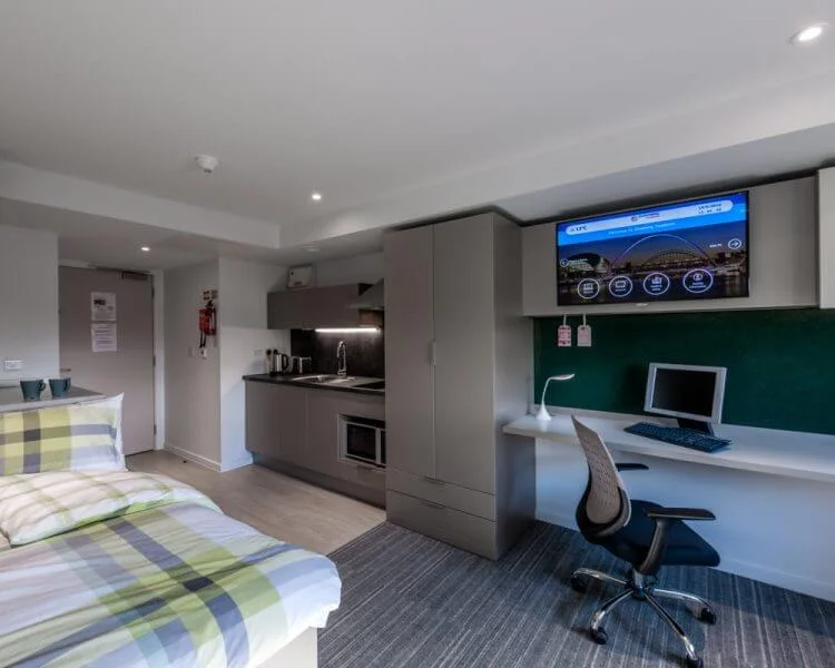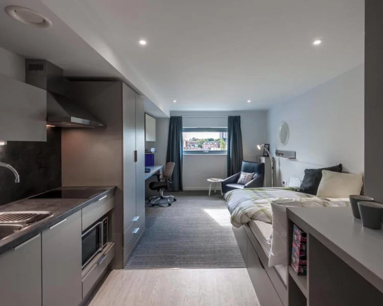 The gold studio caters for all your needs with an average of 22m². A large desk with drawers gives you plenty of space to study and, when you are ready to relax, stretch out on your double bed or watch your Smart TV from the comfort of your armchair. There’s good storage space with cupboards and book shelves, a great kitchen and en-suite shower room. Please note that the ensuite and kitchen area of this studio have been adapted to meet DDA requirements.