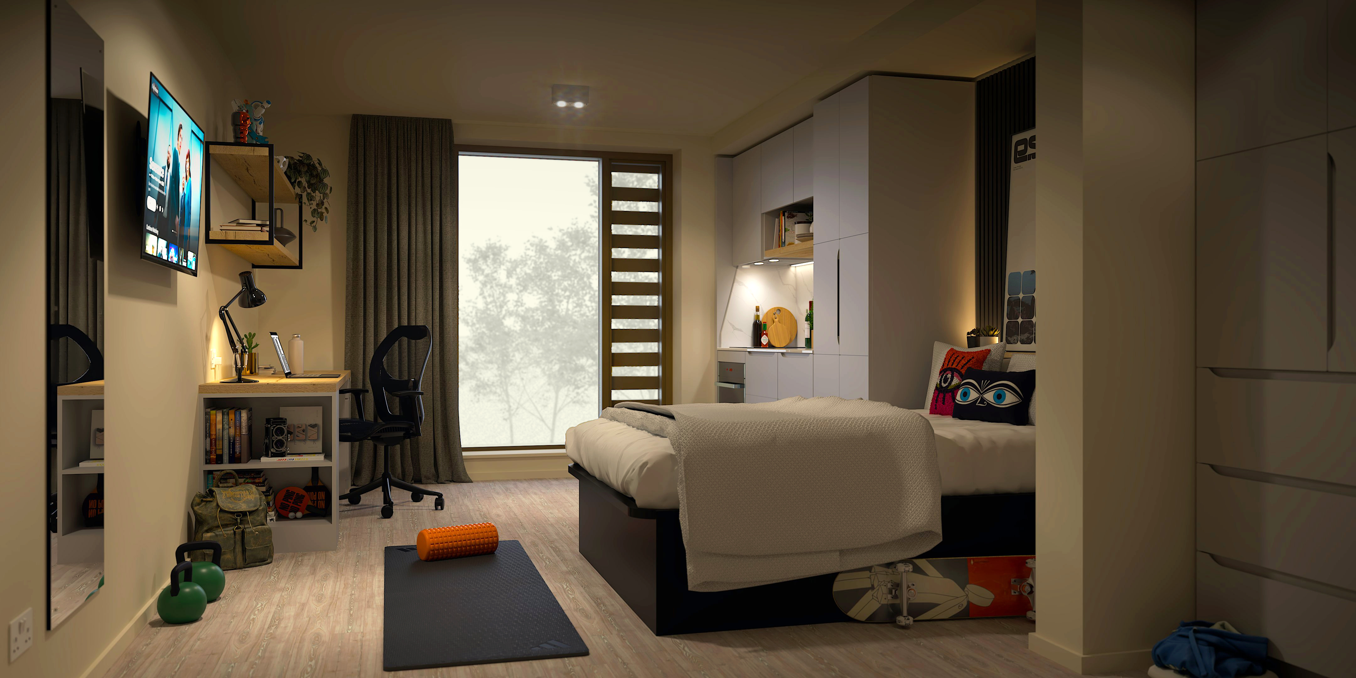 Study in style with the Premium, offering all your favourite features as well as above-desk shelving and extra storage. Upgrade to Premium Plus for additional wardrobe space. Size: 18-20SQM