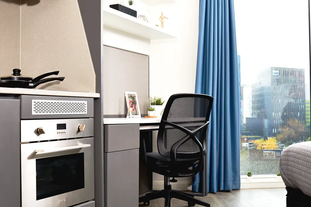 Your own ensuite room with all the standard features, plus social space with a kitchen to share with up to 5 others. Size :- 14-15SQM