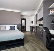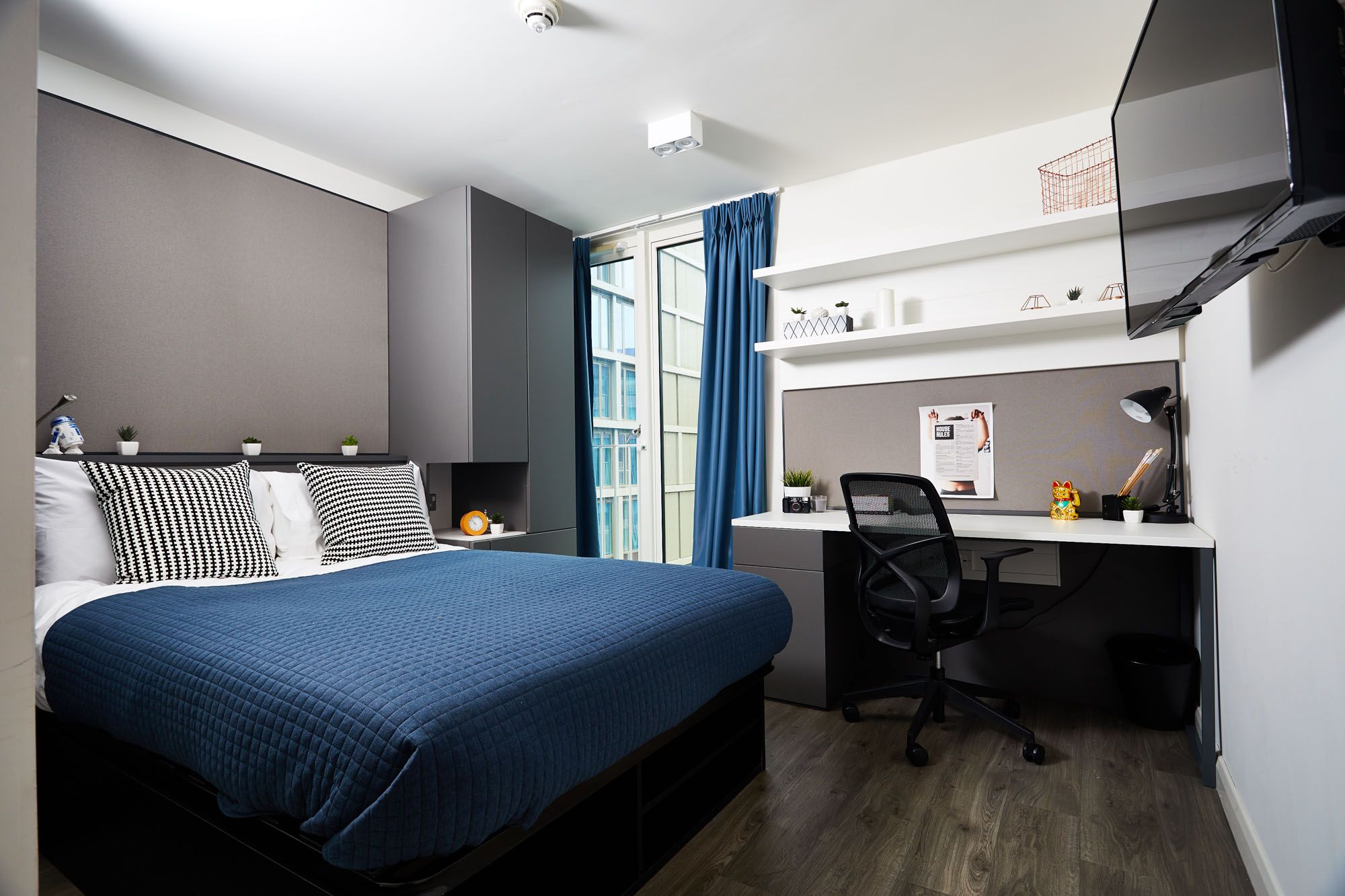 The classic student studio with double bed, ensuite bathroom, desk area and kitchen. Room Size : 16sqm. Prices may vary for floors.