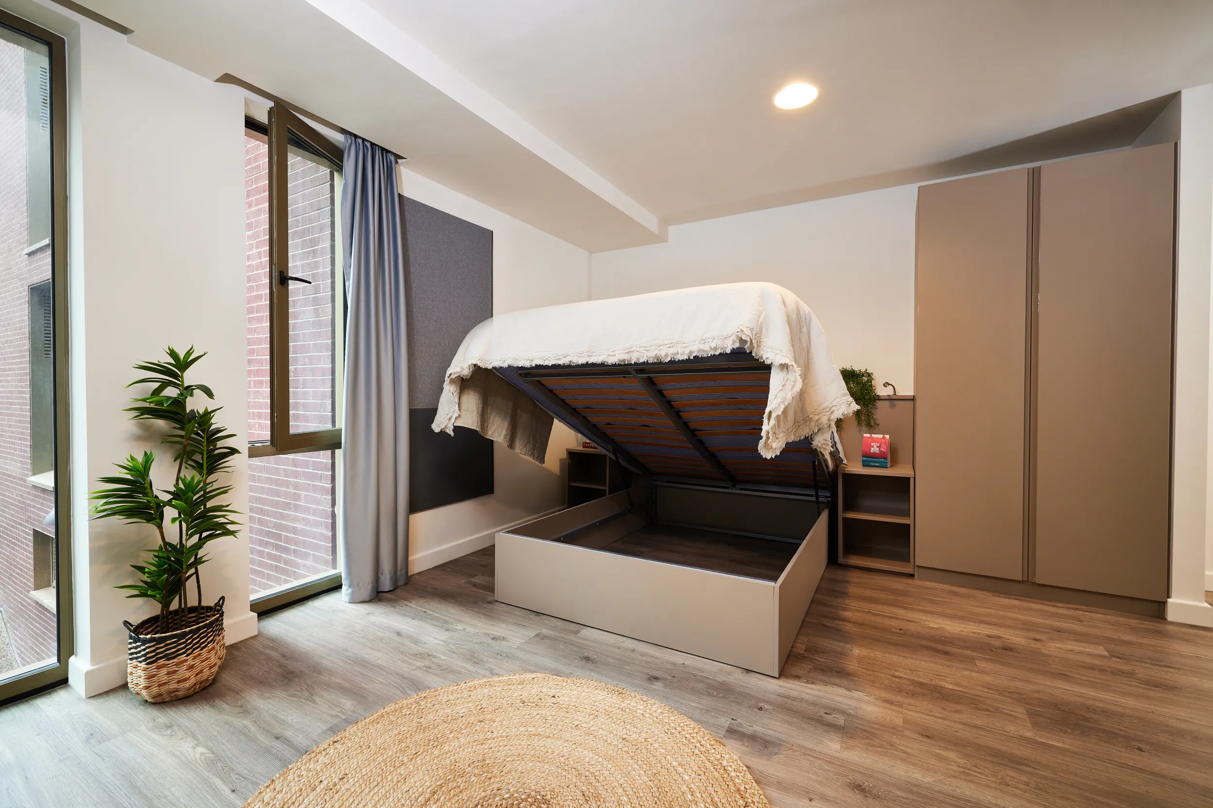 The classic studio with double bed, ensuite bathroom, desk area and kitchen with views of courtyard. Room Size: 19sqm. Prices may vary for floors.