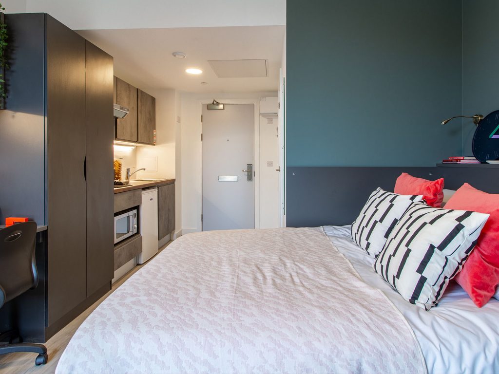 Enjoy a great value studio without compromising on the essentials you need for comfortable living. Each en suite studio comes with a double bed, plenty of workspace and storage, and a PC monitor you can connect your laptop to, perfect for working on a larger screen or binge watching your favourite shows. You will also have access to a fully equipped mini kitchen.