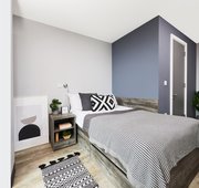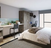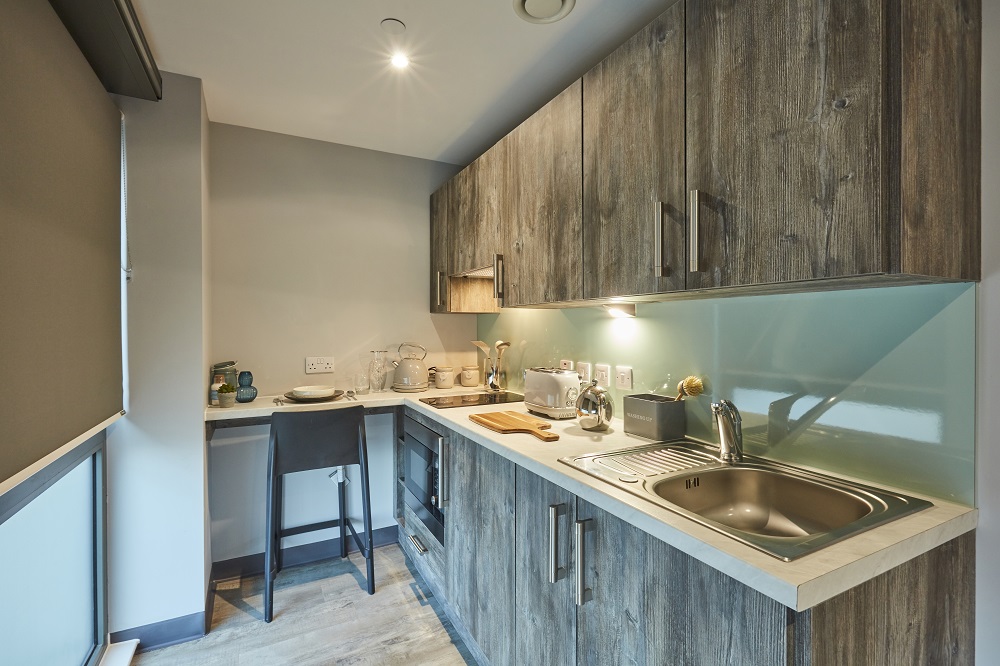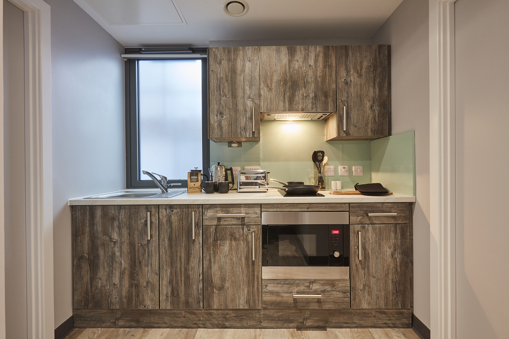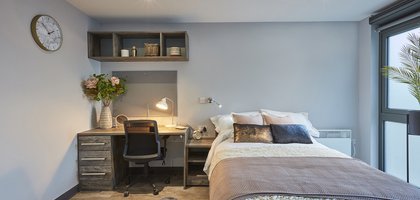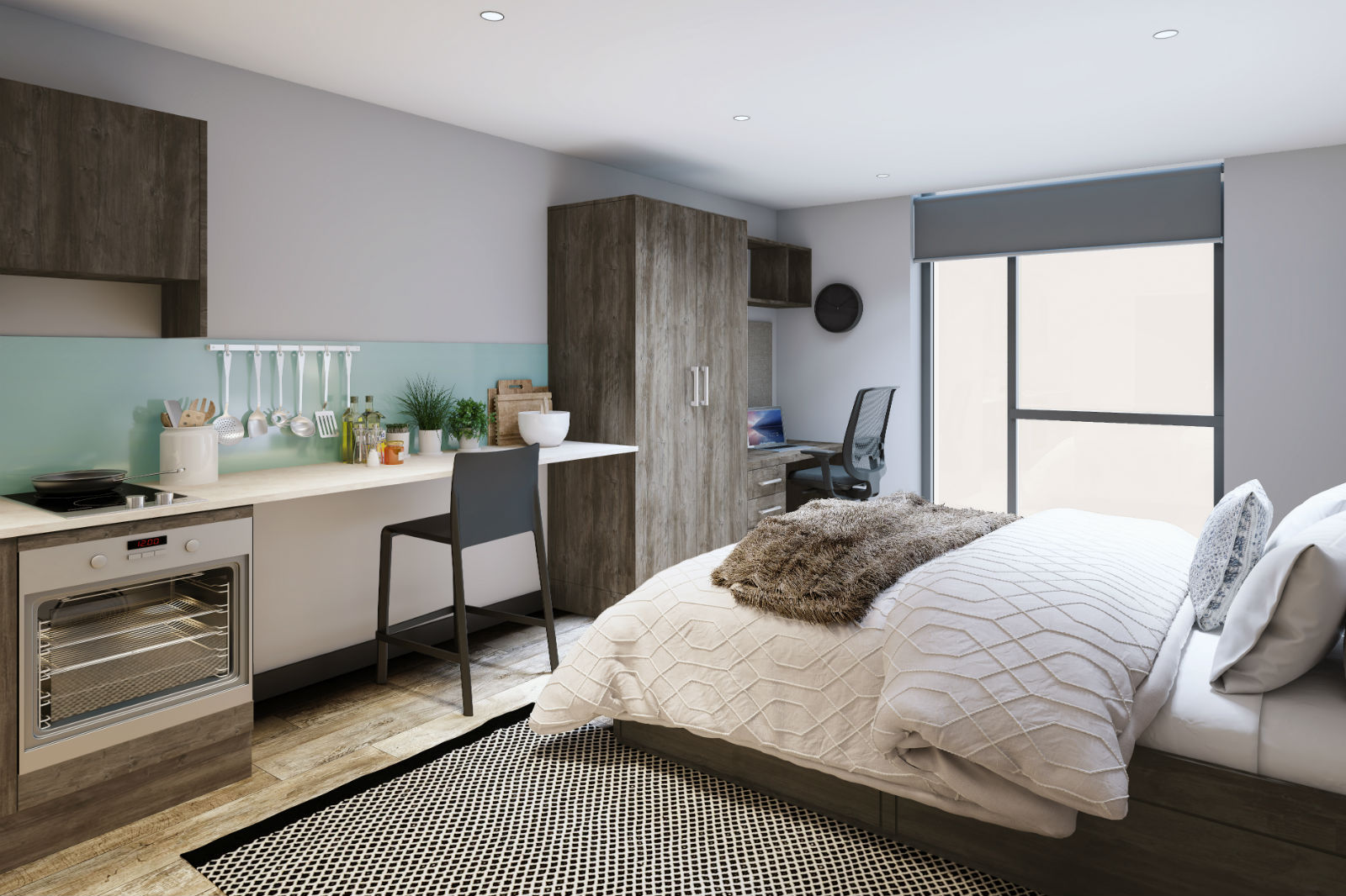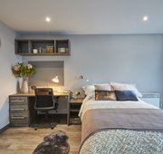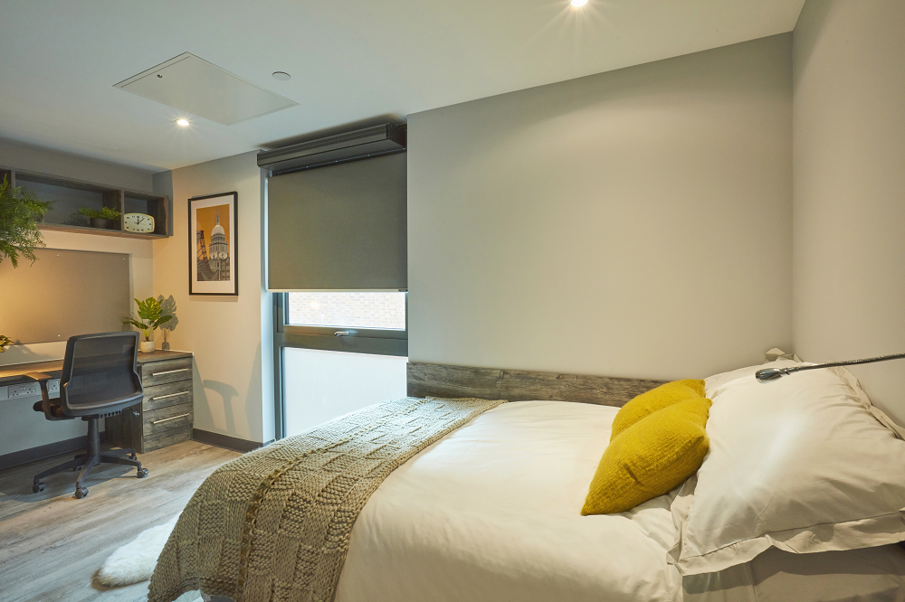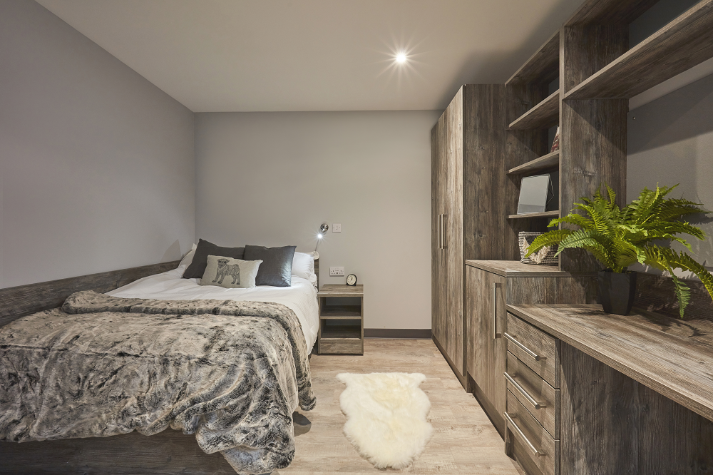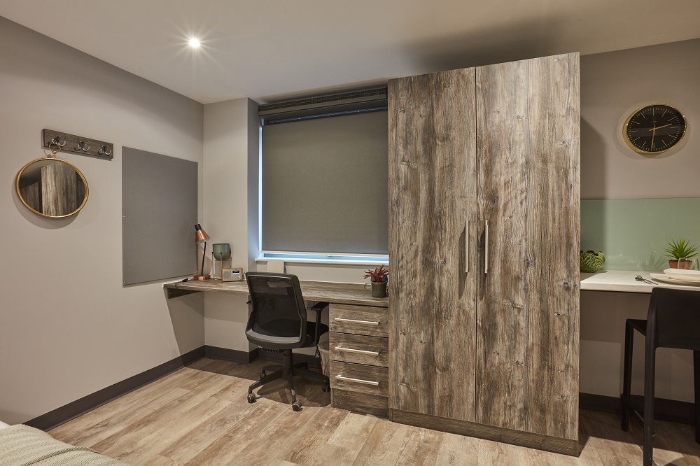 Room Size- 20m2 3/4 size (small double) bed with under bed storage Shared kitchen with ceramic hobs, combi oven, fridge freezer and plenty of storage Living area with TV Private en-suite shower room Study desk Chair Wardrobe Drawers Plenty of storage