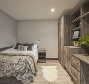 Room Size- 17m2 3/4 size (small double) bed with under bed storage Shared kitchen with ceramic hobs, combi oven, fridge freezer and plenty of storage Living area with TV Private en-suite shower room Study desk Chair Wardrobe Drawers Plenty of storage