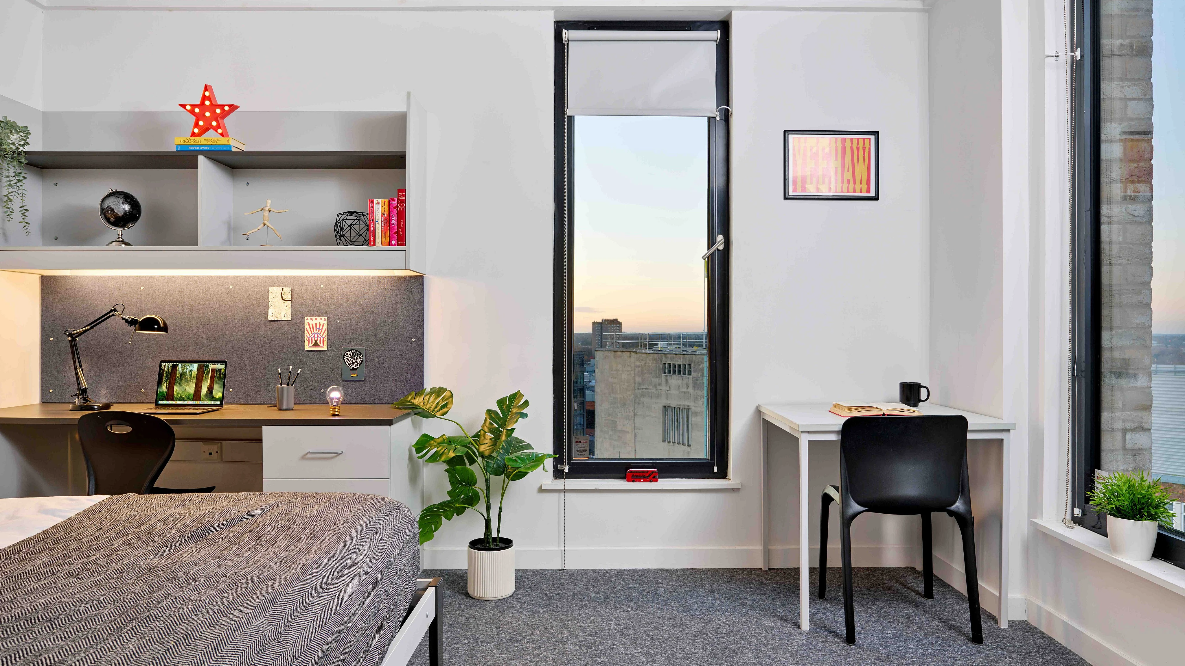 This modern private studio comes with a double bed, fitted wardrobes, study desk and chair, plenty of storage, and your own modern en-suite bathroom. There is also a private kitchenette which includes a fridge/freezer, combined microwave and mini grill oven, hob, kettle, toaster and vacuum.