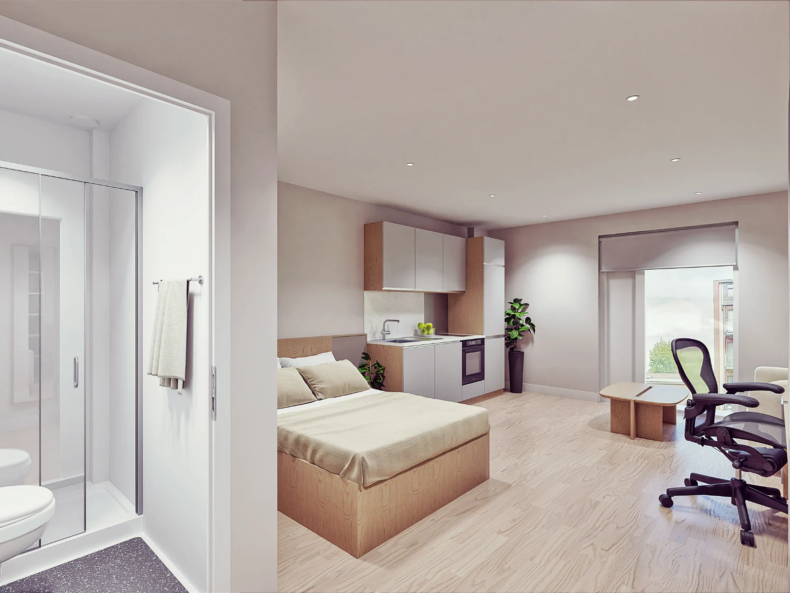 Approx 28-29.5 square metres, The Premium Plus Studio is an accessible studio and has a fully wheelchair-accessible bedroom featuring your own kitchen with height-adjustable worktops, a private wet room, and a spacious living area with a small two-seater sofa. It includes a comfortable double bed, extra storage, and a height-adjustable study desk.