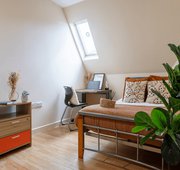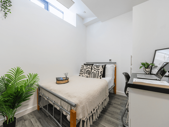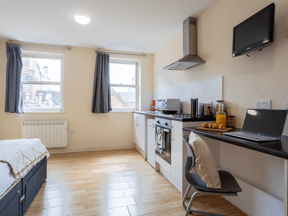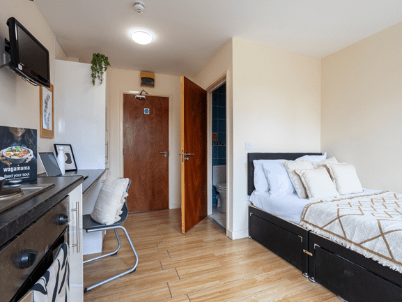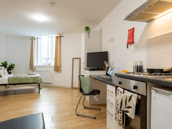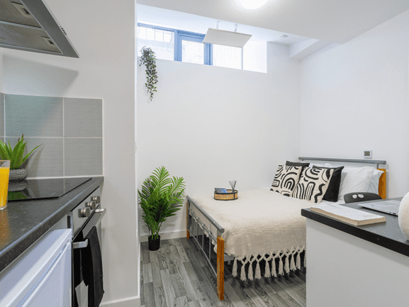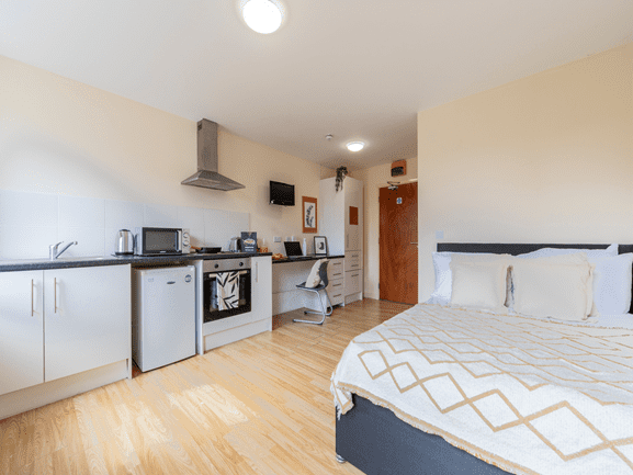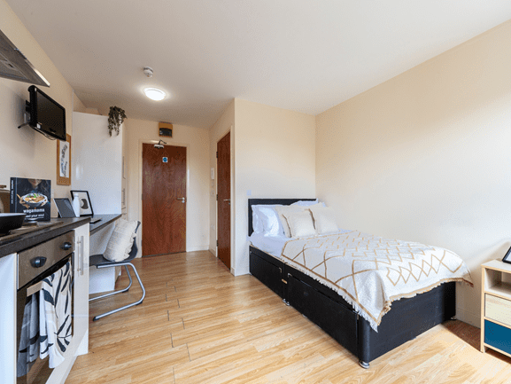 The Gold Studio offers luxury accommodation for university students. The large studio is the perfect place for students who want privacy and independence. The Gold Studio offers a stylish bedroom with a small bed and a study area. Students can enjoy special features like a private bathroom and a well-equipped kitchenette.