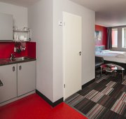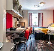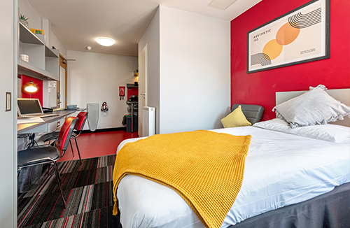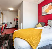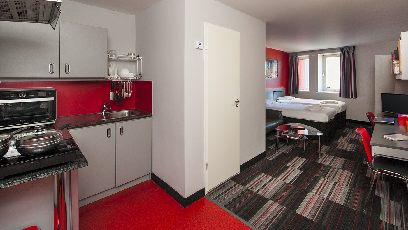 Extra spacious studio apartment with double bed. What's included: Larger than Deluxe Plus Studio rooms Double Bed En-suite shower room Fully equipped kitchenette Flat screen TV Large two-seater sofa Coffee table (wooden / glass) Study Desk and Chair Storage space Extended wardrobe Superfast Wi-Fi