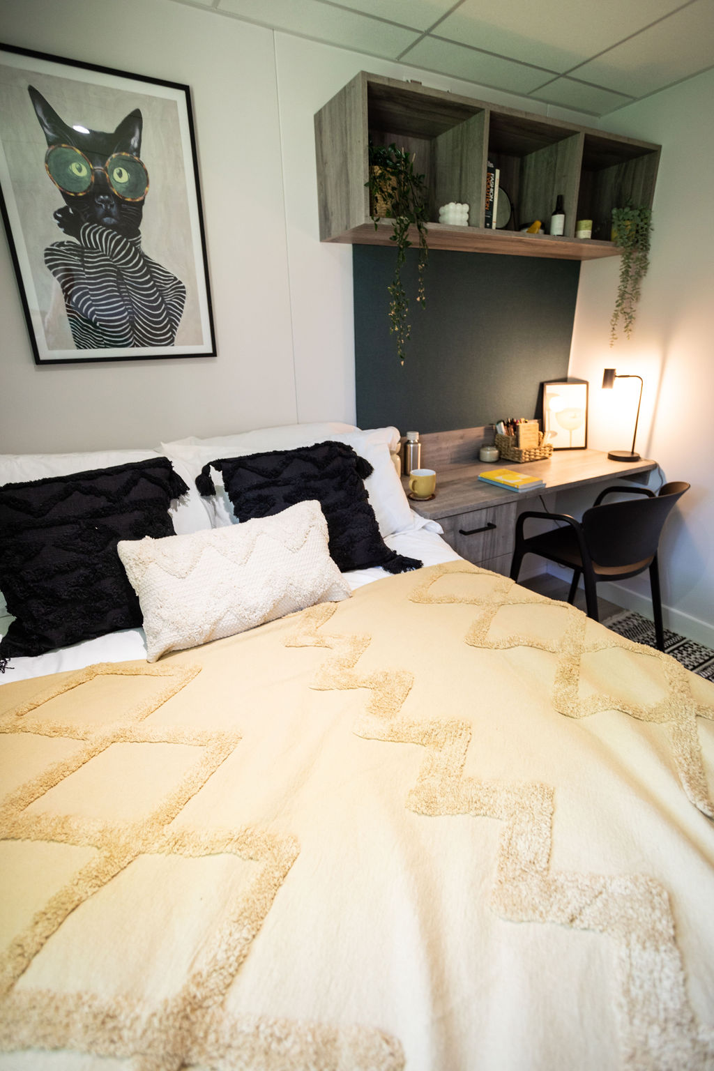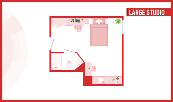 Room sizes may vary from 22 - 24 m2 3/4 size double bed with under bed storage - 2-ring hob with extractor - Breakfast bar - En- suite bathroom with shower and WC - Full-length mirror - Integrated fridge with freezer compartment - Microwave oven - Pinboard - Stool - Study Desk with drawer space and chair - Wardrobe