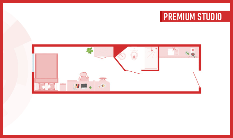 Room sizes may vary from 25 - 27 m2 3/4 size double bed with under bed storage - 2-ring hob with extractor - Breakfast bar - En- suite bathroom with shower and WC - Full-length mirror - Integrated fridge with freezer compartment - Microwave oven - Pinboard - Stool - Study Desk with drawer space and chair - Wardrobe