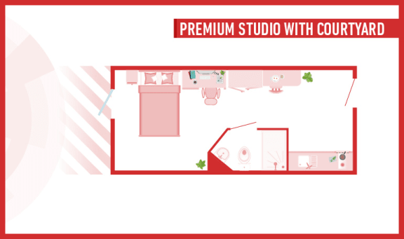 You not only get a Gold Studio with Courtyard but the benefit to a Courtyard access from your own room. Enjoy the comfort of a 3/4 size double bed with under-bed storage in this studio sizing around 18- 19m². The kitchenette features a 2-ring hob with an extractor and a breakfast bar. An en-suite bathroom with a shower and WC provides added convenience, while amenities such as a full-length mirror, integrated fridge with freezer compartment, microwave oven, pinboard, stool, study desk with drawer space and chair, and wardrobe enhance the living experience.