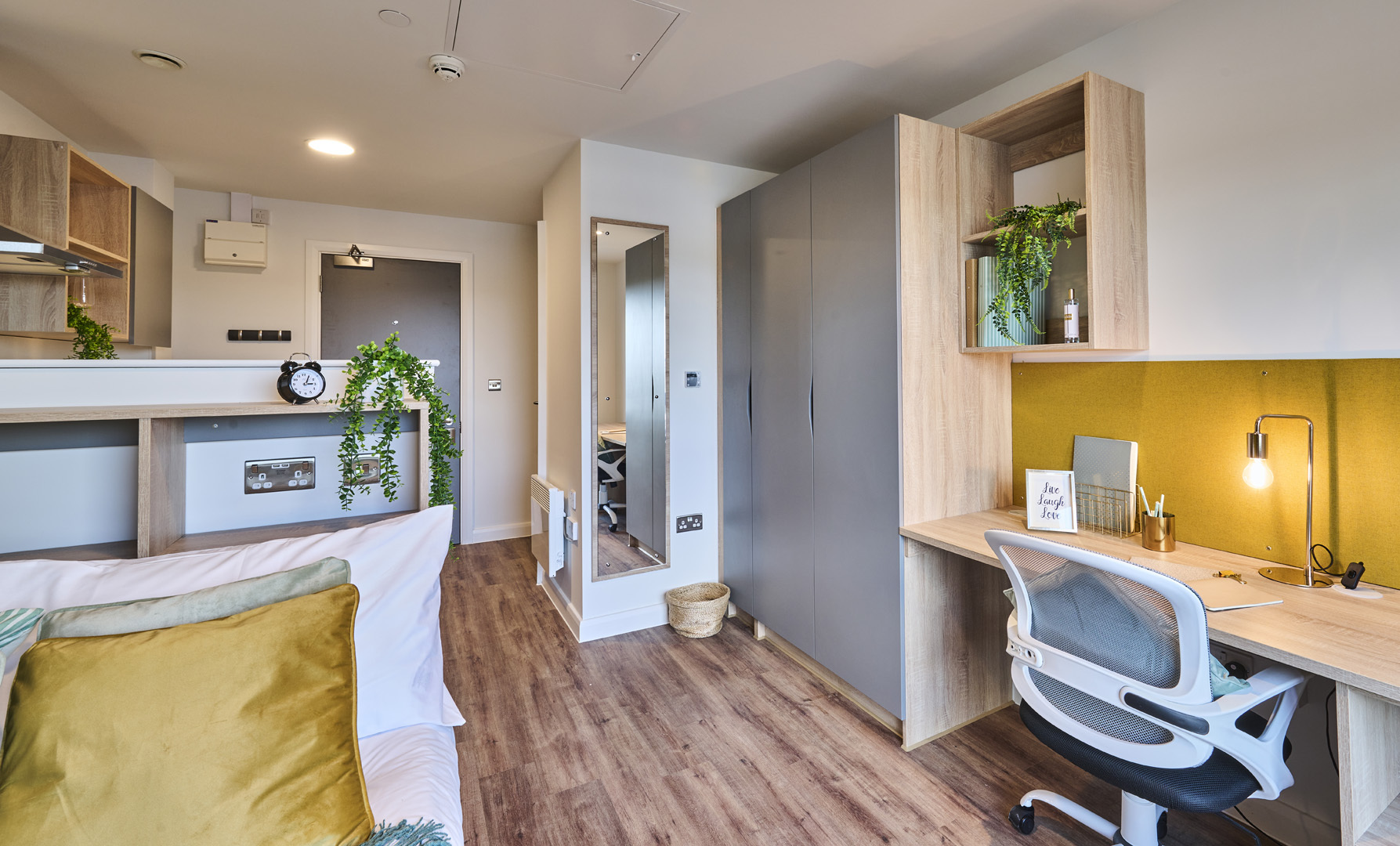 Self-contained kitchen, bathroom, and living space. Small Double Bed Wardrobe, desk, and chair included. En-suite shower room, WC & basin