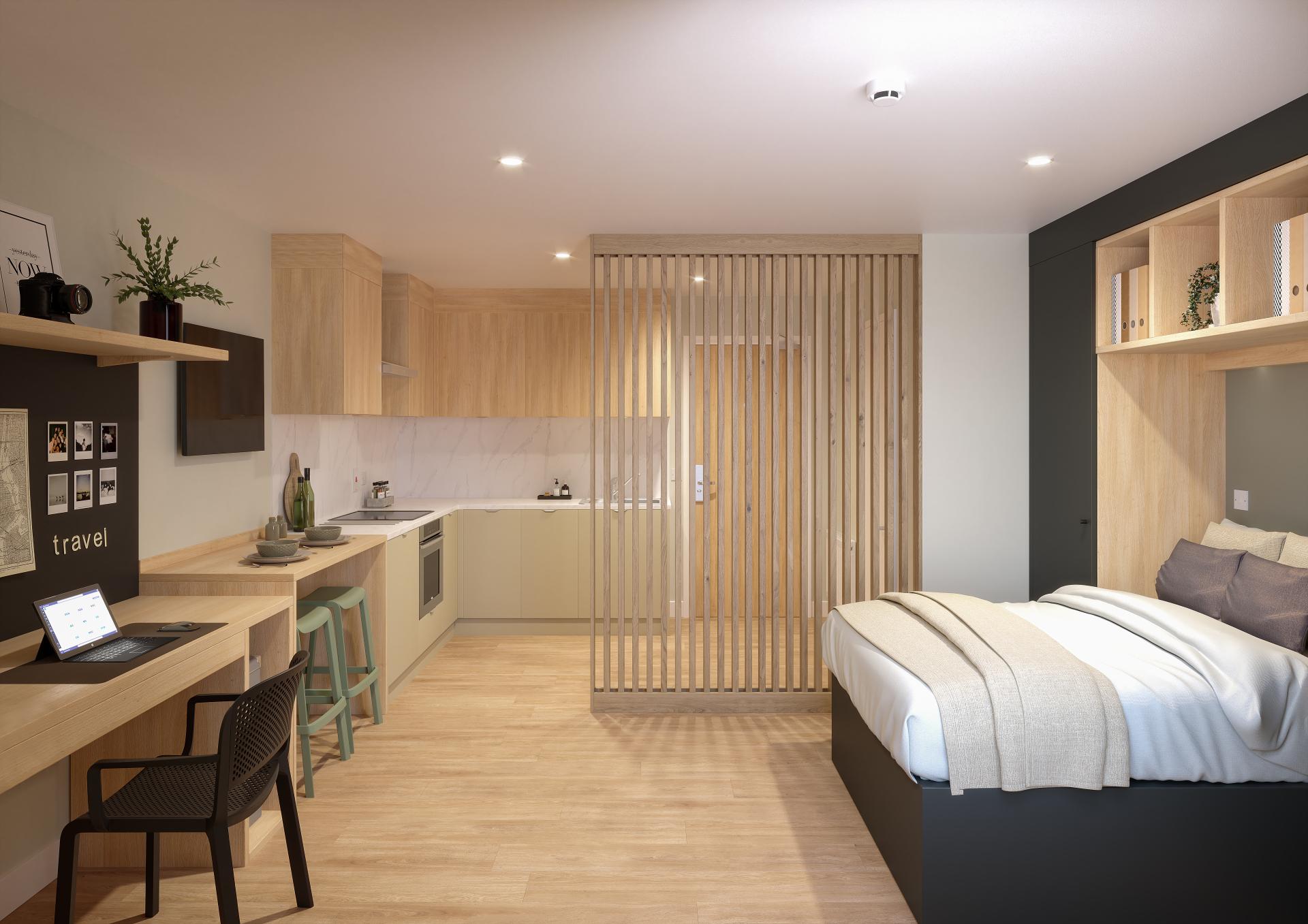 Your personal sanctuary designed for positive living. With calming wood textures and soft pastels, this studio offers a peaceful retreat from busy student life. Thoughtful storage solutions, a luxury en-suite, and a fully equipped kitchenette make everyday living effortless. Whether you’re cooking, relaxing, or hosting friends, every detail helps you feel right at home from day one. All-inclusive utilities and a double bed ensure comfort and convenience, letting you focus on making the most of your university experience. **Price may vary according to the floor level**