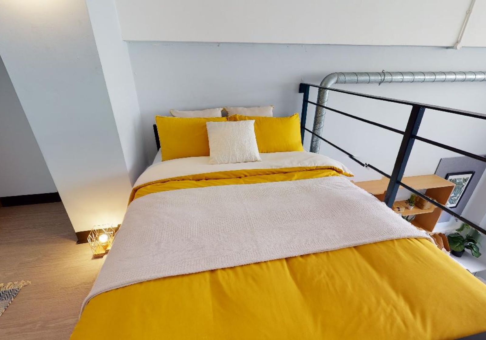 EXCH400-031125One of most popular room types thanks to its unique layout, with two en suite mezzanine bedrooms per apartment. Your mezzanine sleeping area comes with double bed, private en suite shower room, your own study area and a big kitchen and lounge area shared with your housemate. Perfect for friends sharing, these big apartments give you plenty of room to relax, entertain, cook and study.