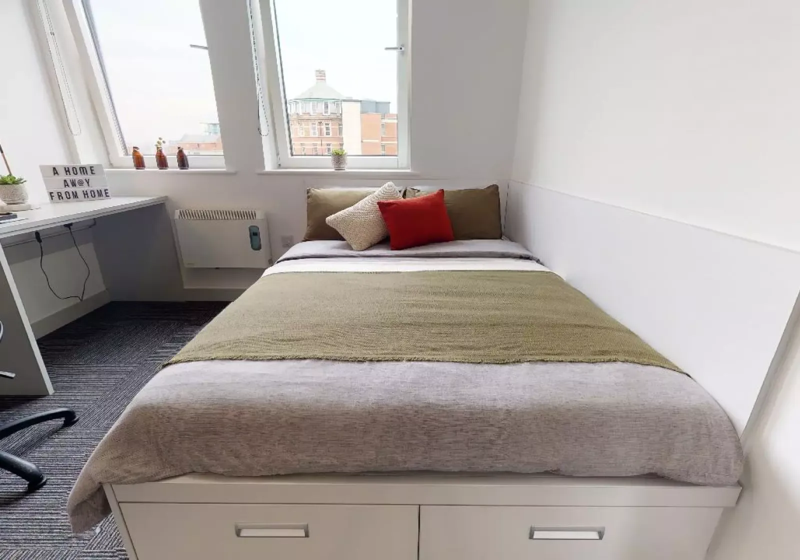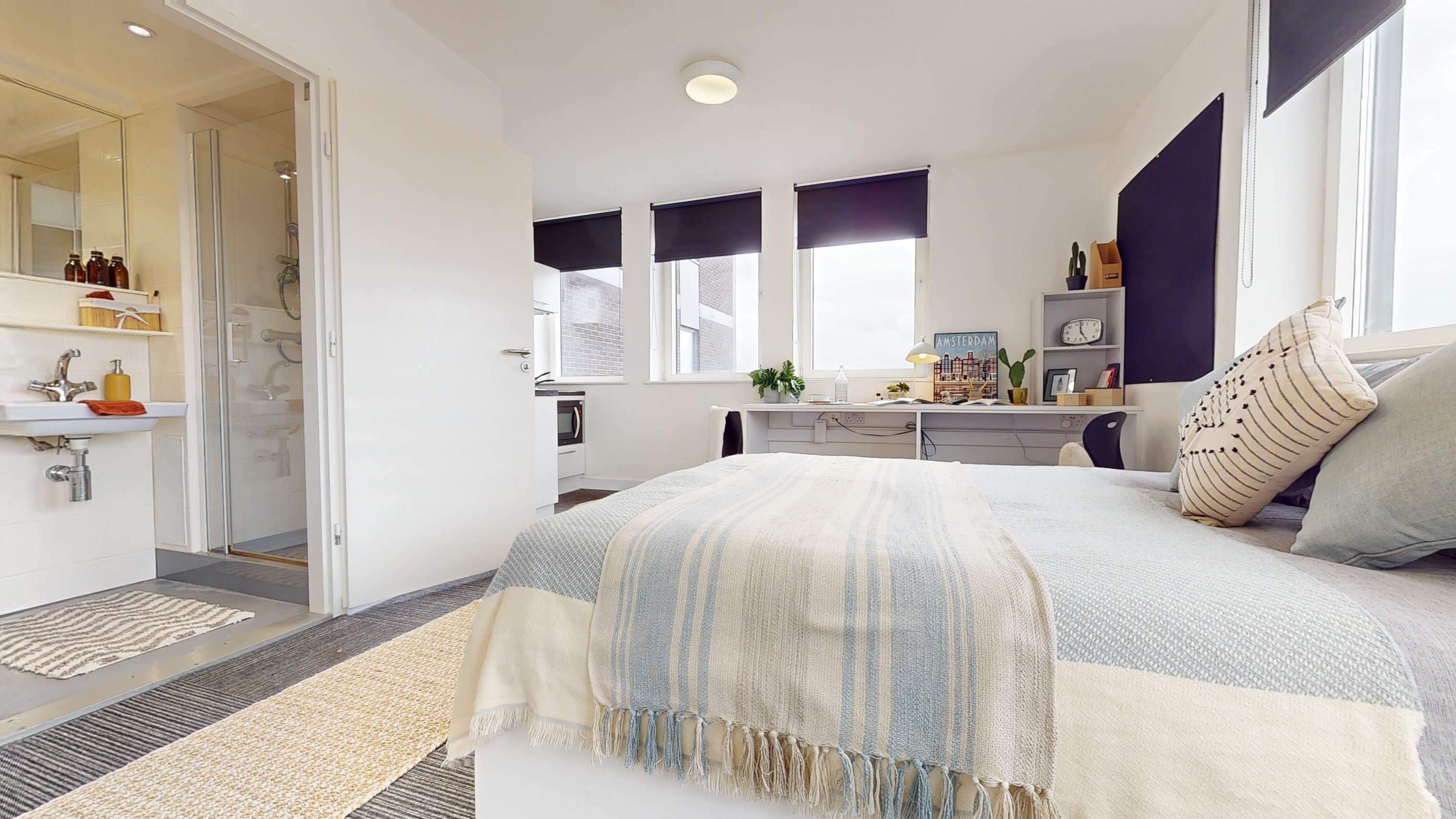 NEWL400-031125These entry-level rooms on floors 3-7 are super value, giving you a private kitchenette and bathroom, double bed and a bright, airy feel. Many of these rooms have great views, with some overlooking Nottingham Castle. With multiple windows giving lots of natural light, plenty of storage, study area and stylish design, these rooms have got it all. Building benefits include a huge social space with TVs and pool tables and an onsite gym.