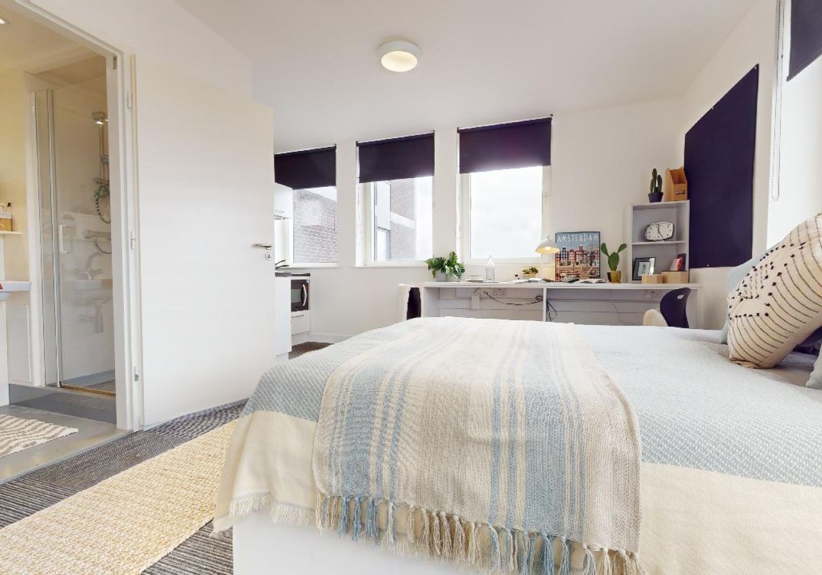 NEWL400-031125With all the same great features as Bronze Studio rooms, these bright, airy 20 sq m rooms have a little extra space and still include private kitchenette and bathroom, double bed. Many of these rooms have great views, with some overlooking Nottingham Castle. With multiple windows giving lots of natural light, plenty of storage, study area and stylish design, these rooms have got it all. Building benefits include a huge social space with TVs and pool tables and an onsite gym.