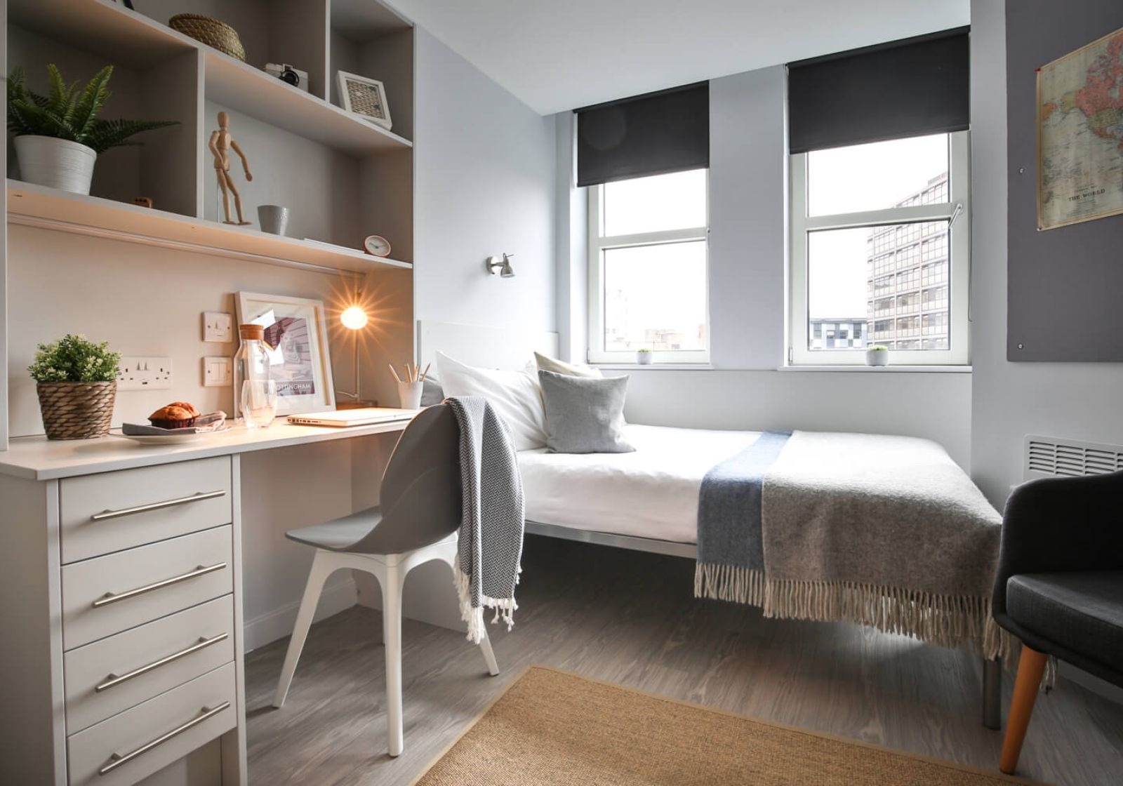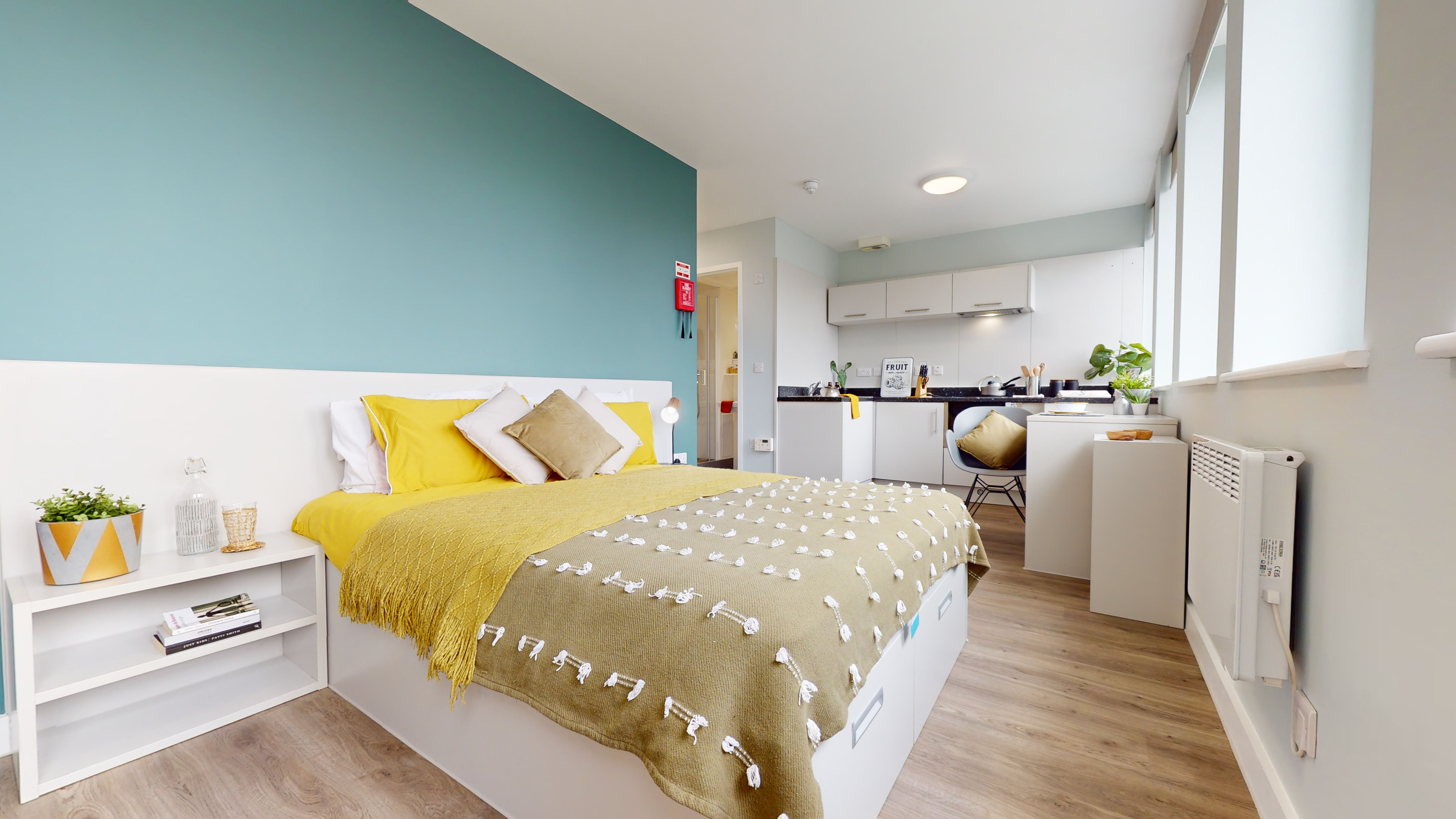 NEWT400-031125These rooms are super value, giving you private kitchenette and bathroom, double bed and a bright, airy feel. Many of these rooms have great views, with some overlooking Nottingham Castle. With multiple windows giving lots of natural light, plenty of storage, study area and stylish design, these rooms have got it all.