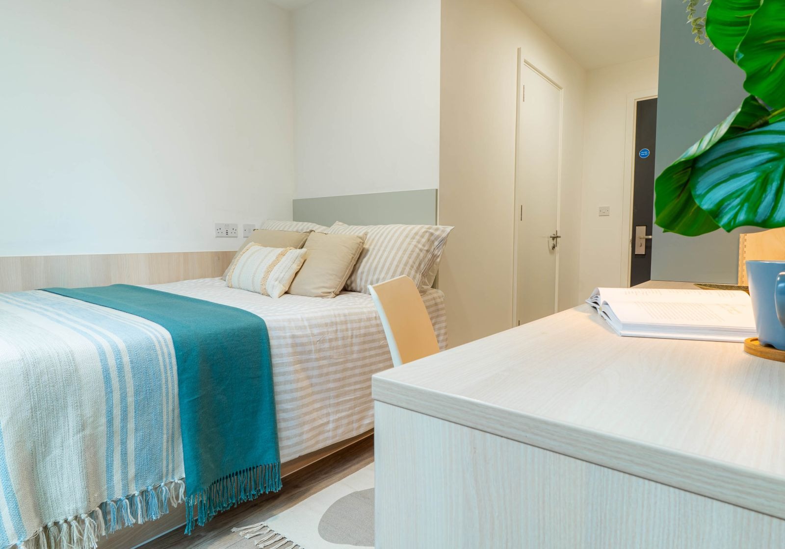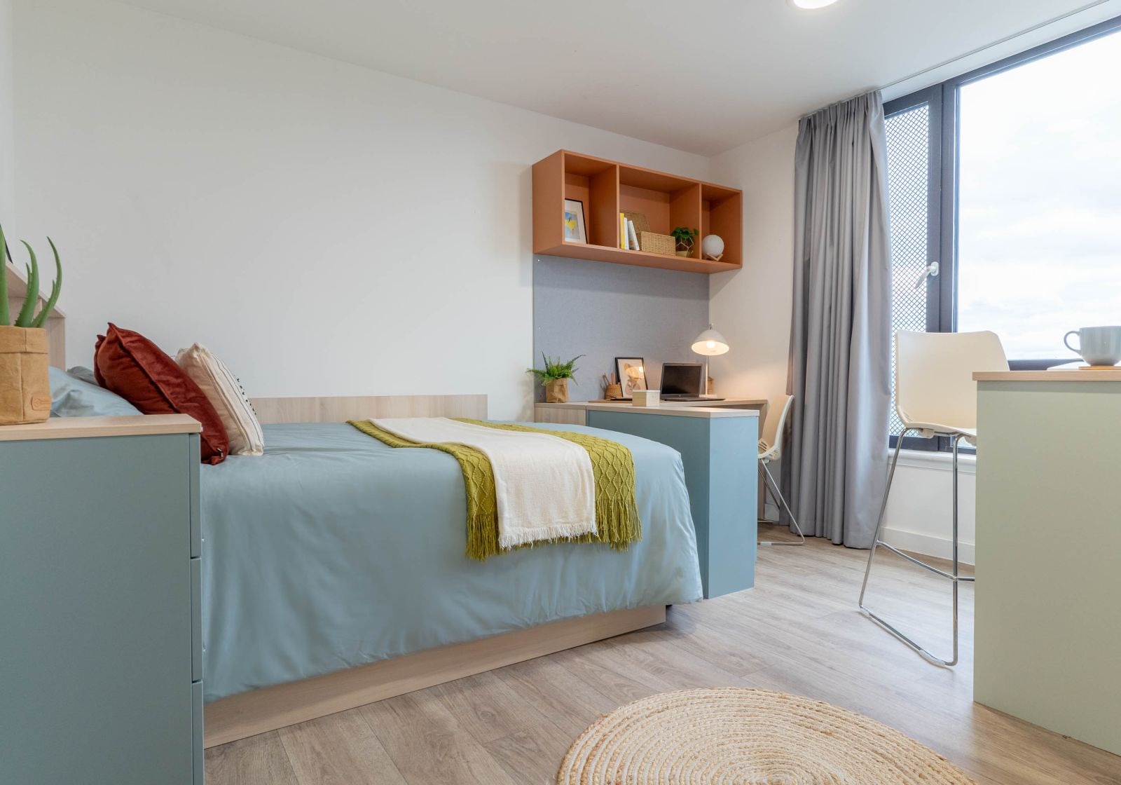 SIGN400-031125Enjoy a bright and modern bedroom with your own private bathroom - and the social buzz of a shared kitchen.\n\nYour room comes fully furnished with a bed, study desk and chair, plus your own private bathroom. With a roof terrace, fitness studio and games room onsite, there's always something for you to keep busy with.\n\nYou're on track for your best year yet.